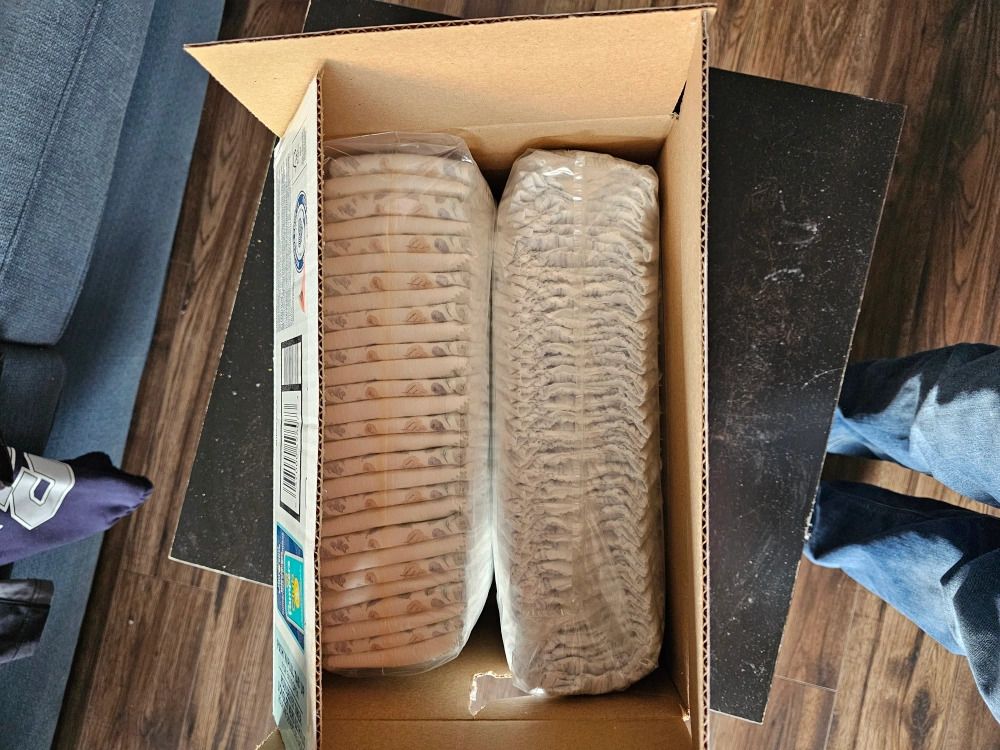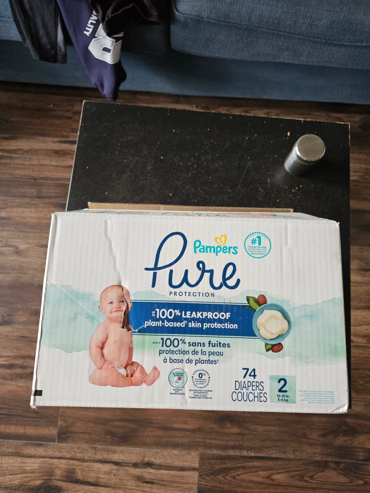 3874 Pampers Pure Protection diapers. Size 2. Plant-based. Leakproof. Two packs of 37 diapers each. Box opened to check but our baby has moved to bigger size..