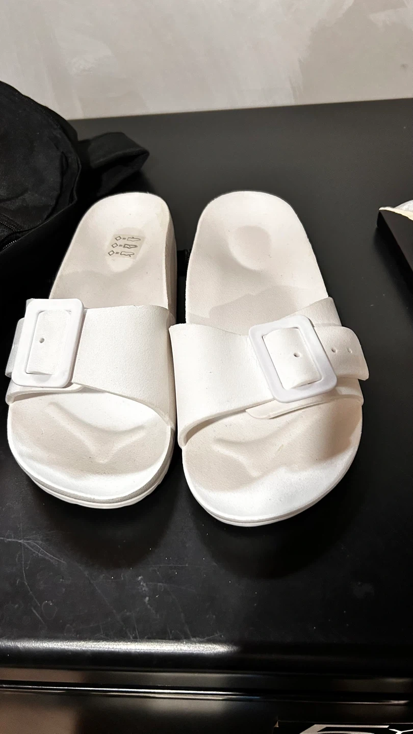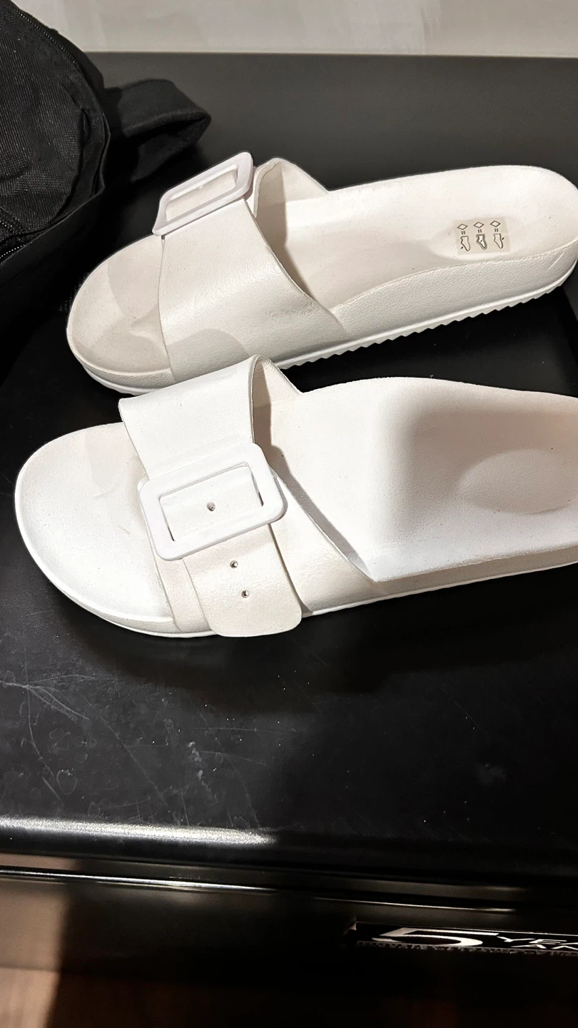 Comfortable white slides with adjustable buckle straps. Made from a durable, flexible material. Perfect for casual wear or around the house!