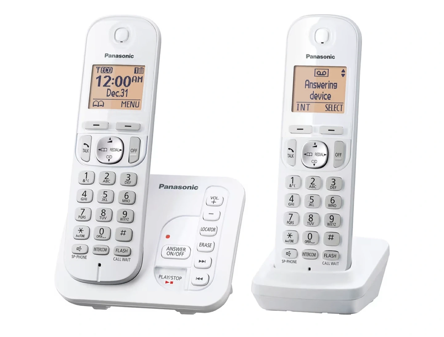 10Selling a Panasonic cordless phone system. It includes the base station and two handsets. Perfect for home or office use! The phone has an answering device, caller ID, and an intercom feature for easy communication within the house