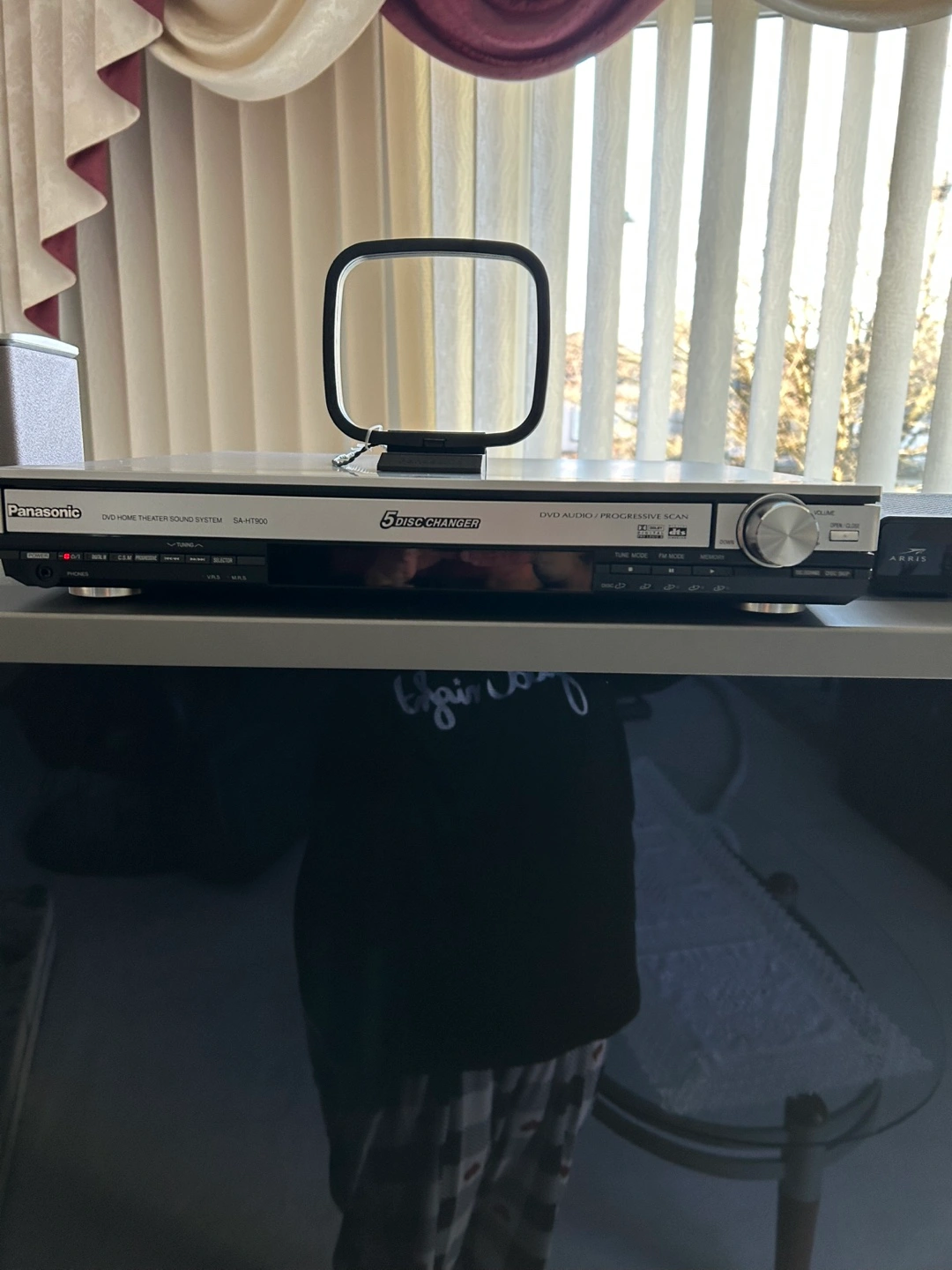 205.1 channel home theatre system. Includes DVD player, subwoofer, centre speaker, and two floorstanding speakers. Silver finish. Hardly used.