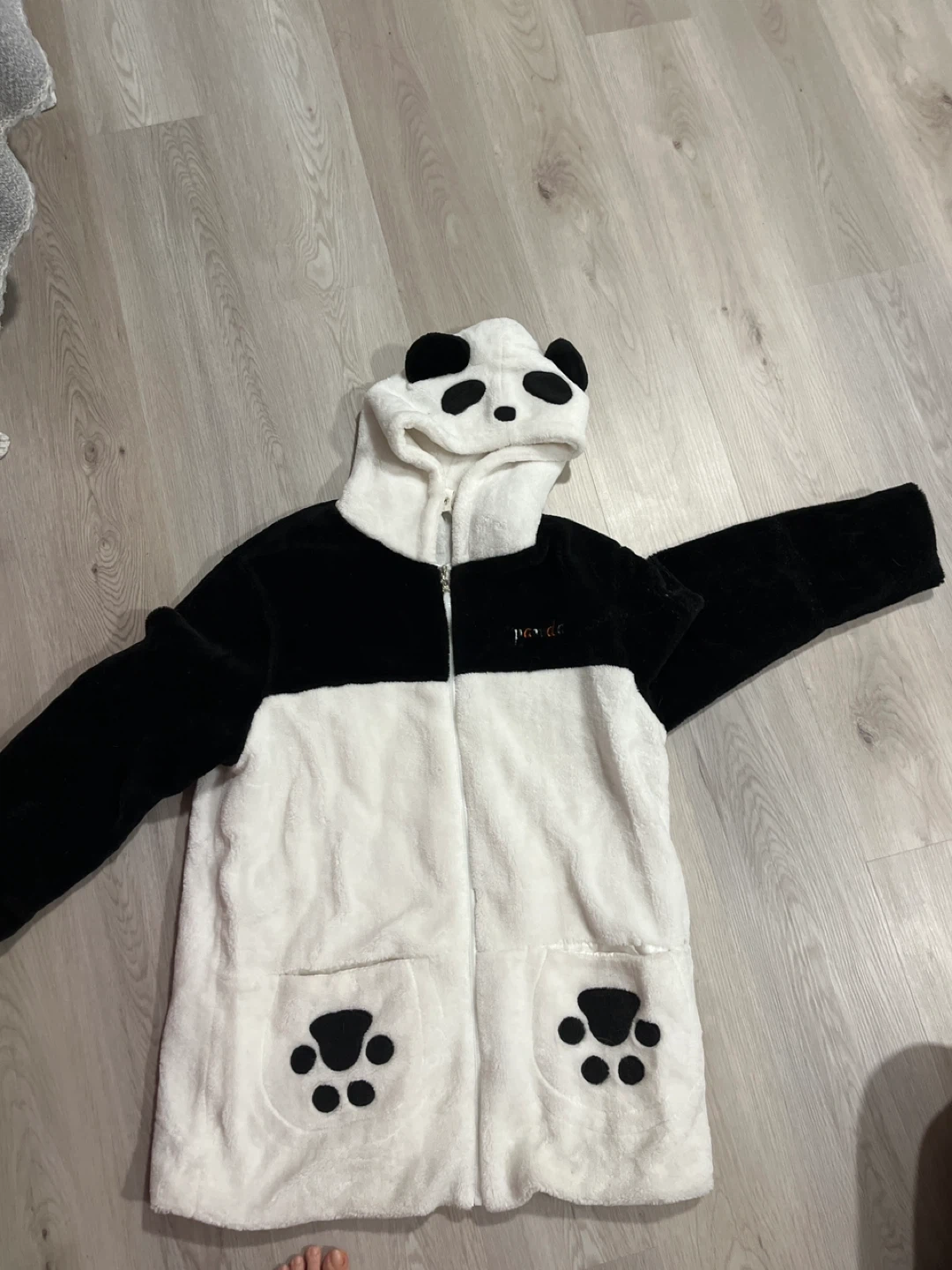 Super cute panda hooded robe! It's black and white, fuzzy, and has paw prints on the pockets. Perfect for lounging around the house