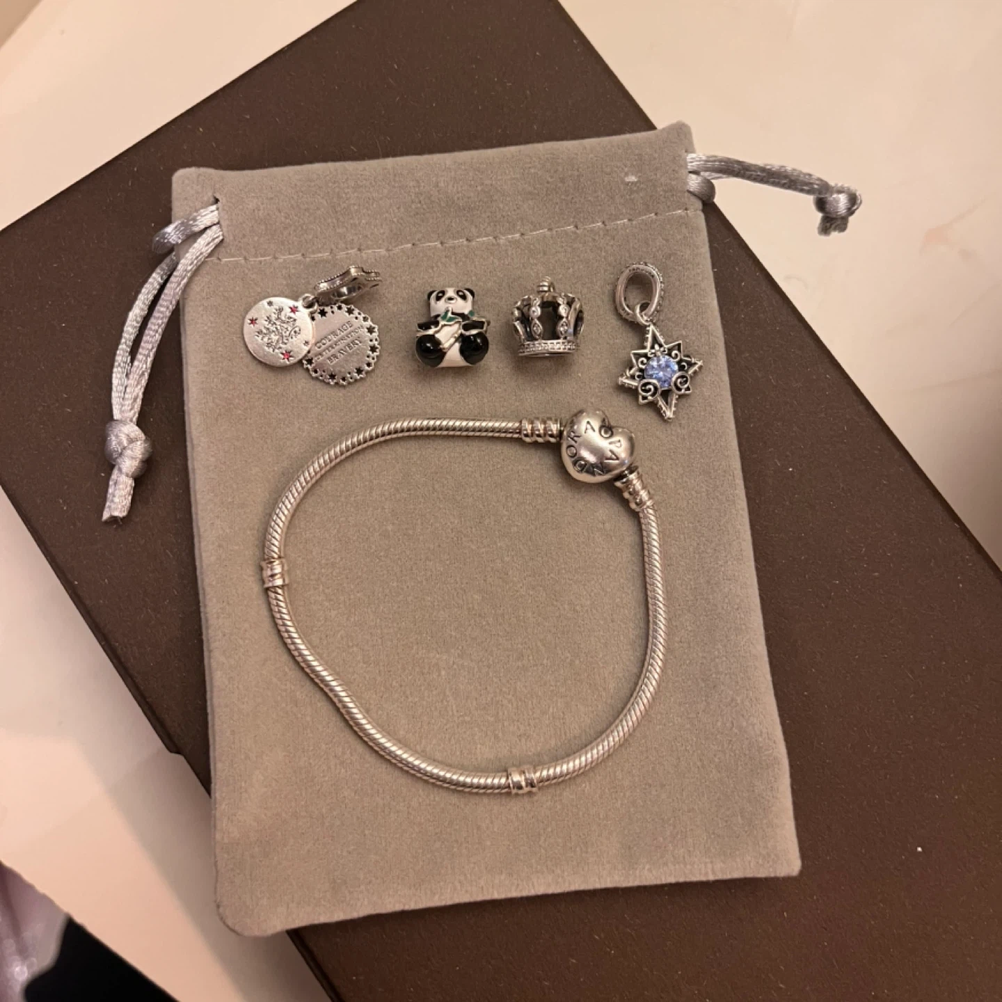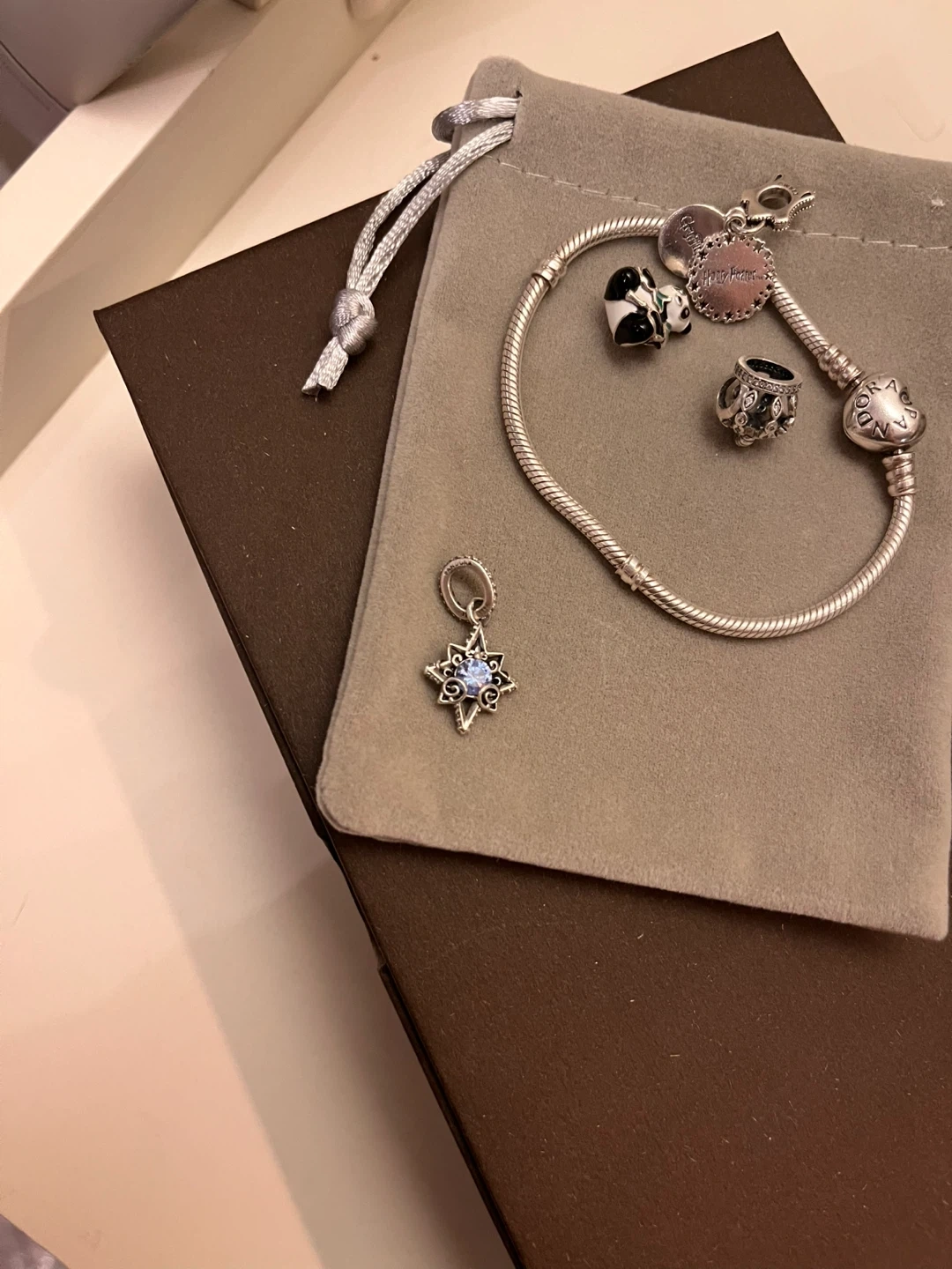 542Selling a Pandora bracelet with a few cute charms! Together for 60$ band 35$ charms 15$ each Charms are: Panda, Disney Frozen, Harry Potter Gryffindor, crown
