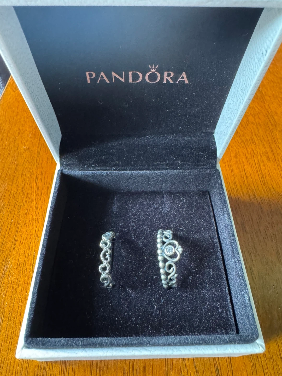 Selling two beautiful Pandora silver rings. They come in the original Pandora box. All they need is a good cleaning and would be like brand new.