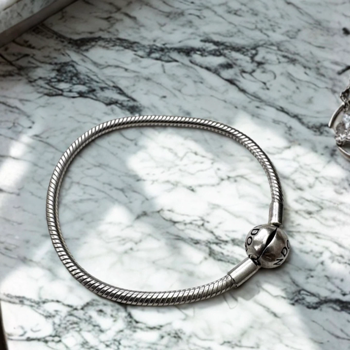 60Selling a lovely Pandora silver snake chain bracelet! It's in great condition and ready for a new home. Perfect for adding your favourite charms and creating a personalized piece of jewellery! Regular price on the Pandora website | $100+ | not including tax and or shipping fees.