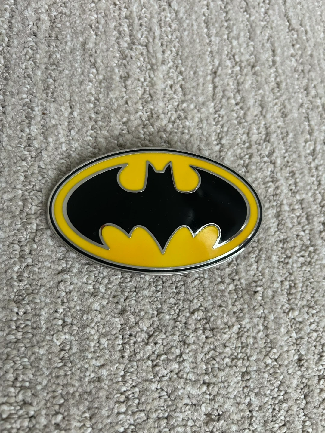 This is a silver-toned belt buckle featuring the classic Batman logo in black and yellow. It's made of metal. A great accessory for any fan!