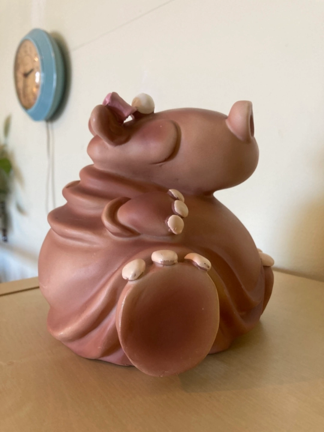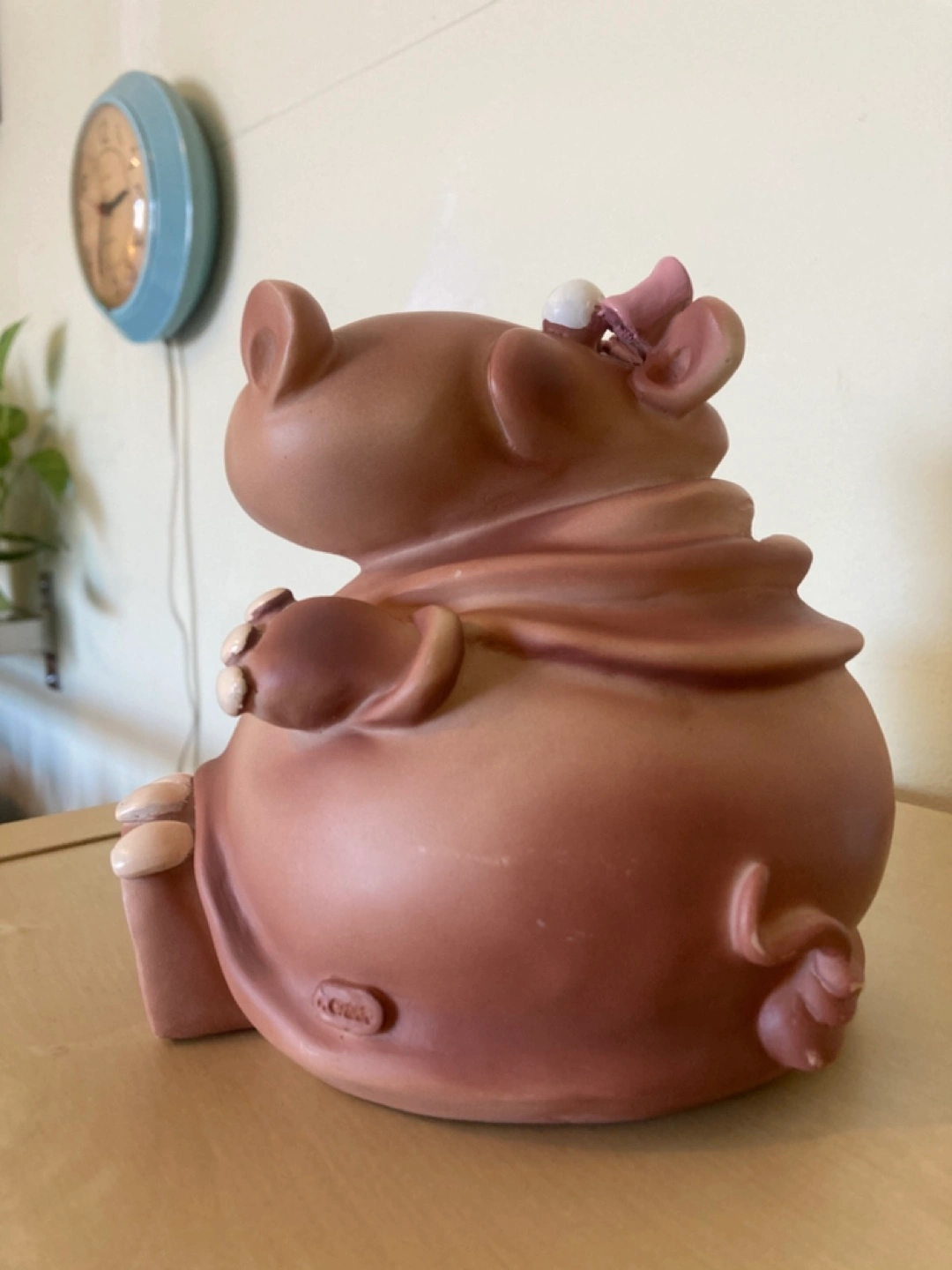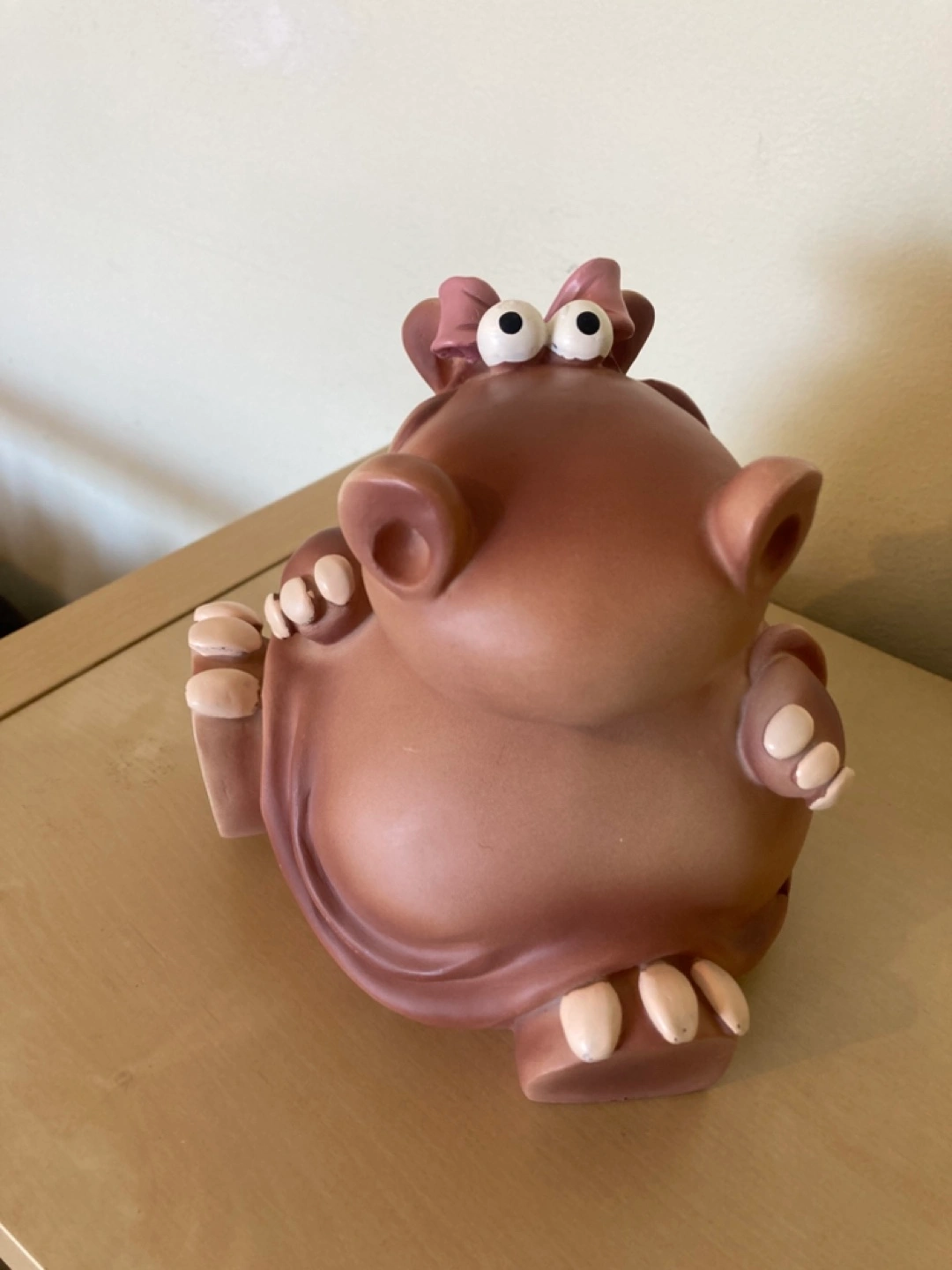 100Collectible Paolo Chiari hippopotamus with bow coin bank, made of resin, adorable and rare. 6” high, 6” wide and 6” deep. Pick-up only near Dufferin Station.