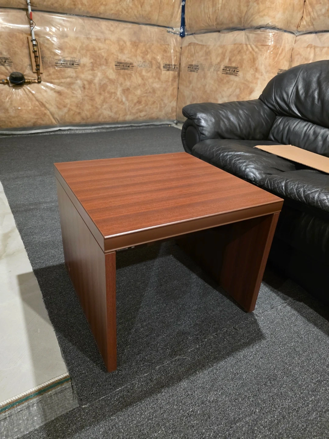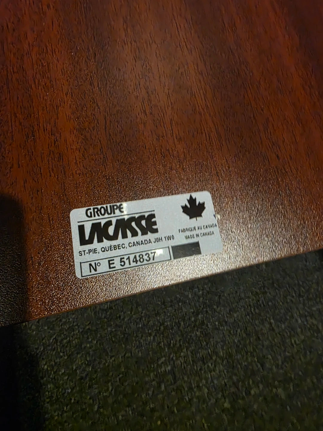 This is a wooden side table from Groupe Lacasse. It's finished in a dark wood grain. It's a sturdy little table that would fit well in a den or living room.