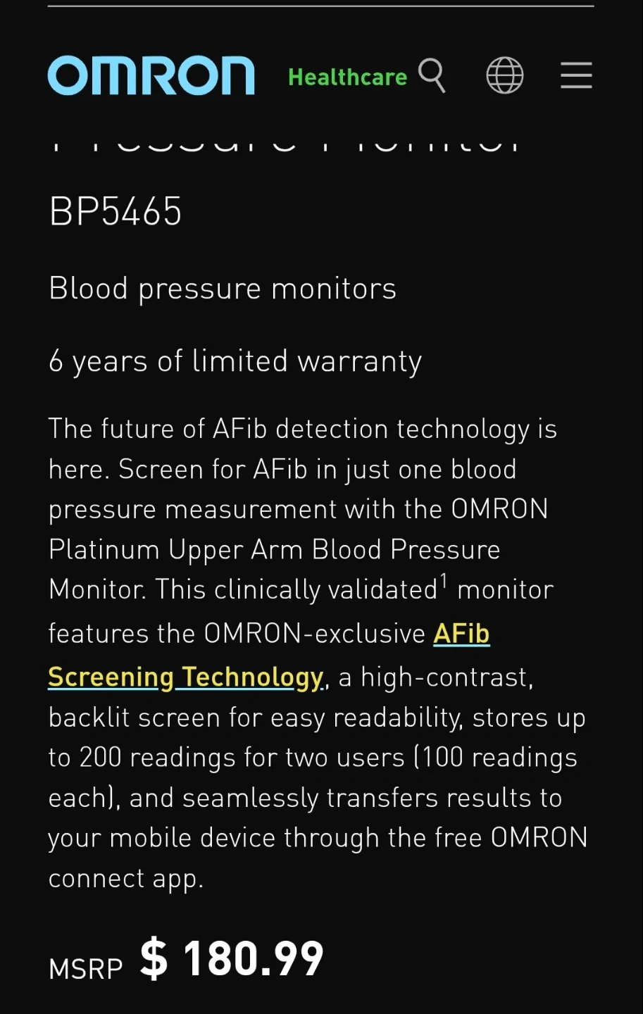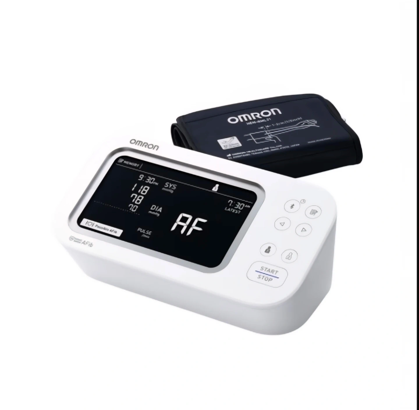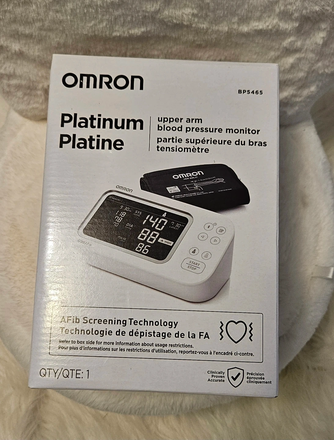 This Omron Platinum Upper Arm Blood Pressure Monitor is designed for easy and accurate readings. It features AFib Screening Technology and a high-contrast, backlit screen for clear visibility. The monitor can store up to 200 readings for two users. It includes the cuff and the main unit. Fits arms 9"-17" [22cm-42cm] in circumference.
