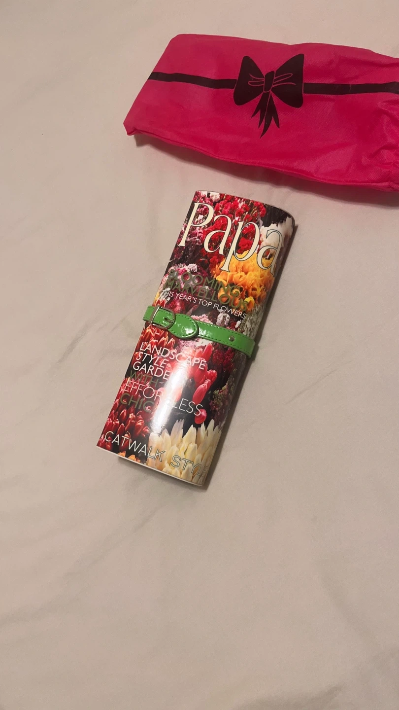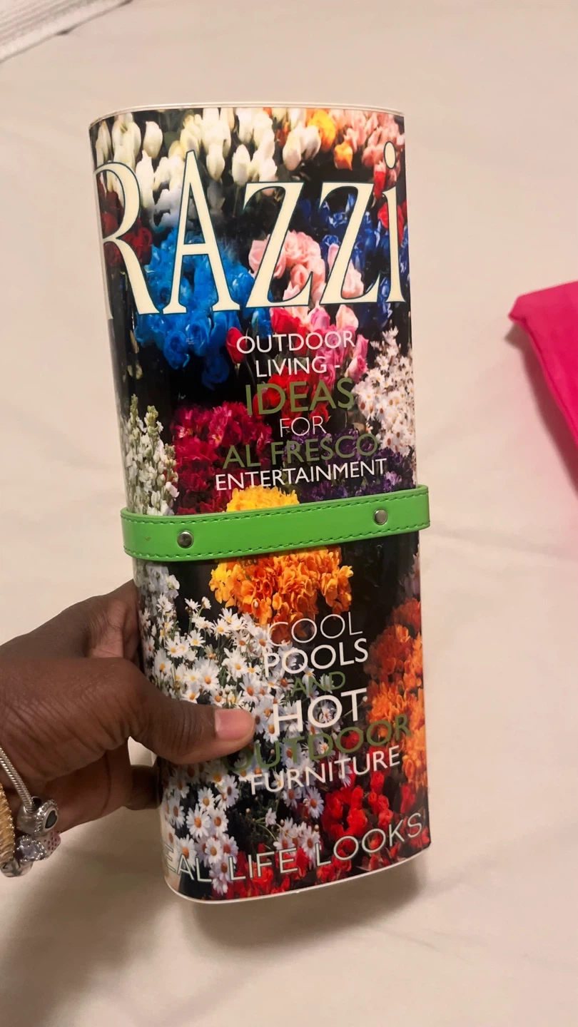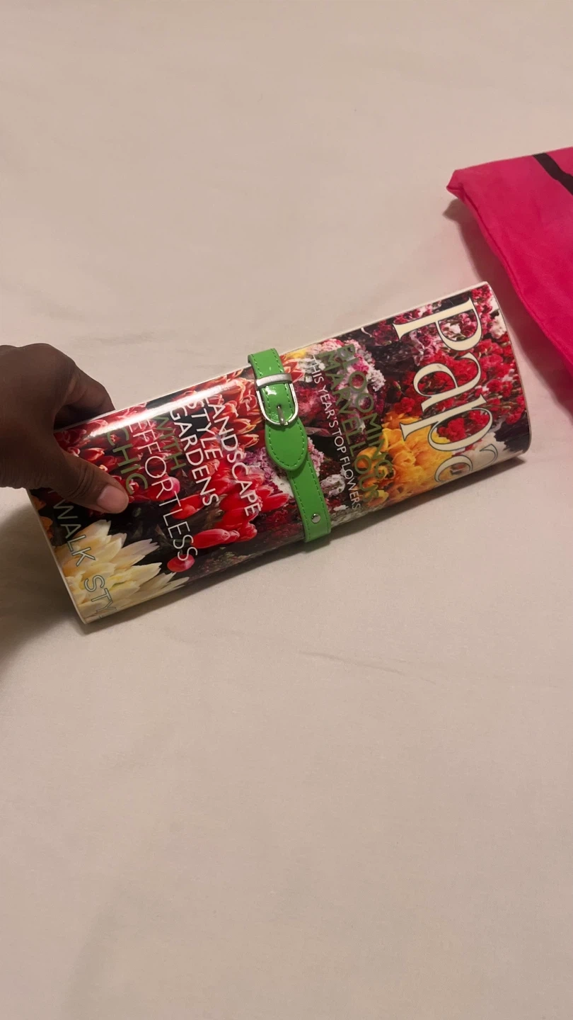 70Selling a Papa Razzi clutch bag with a colourful floral design. It has a vibrant orange interior and a unique green strap. Comes with a pink dust bag for storage