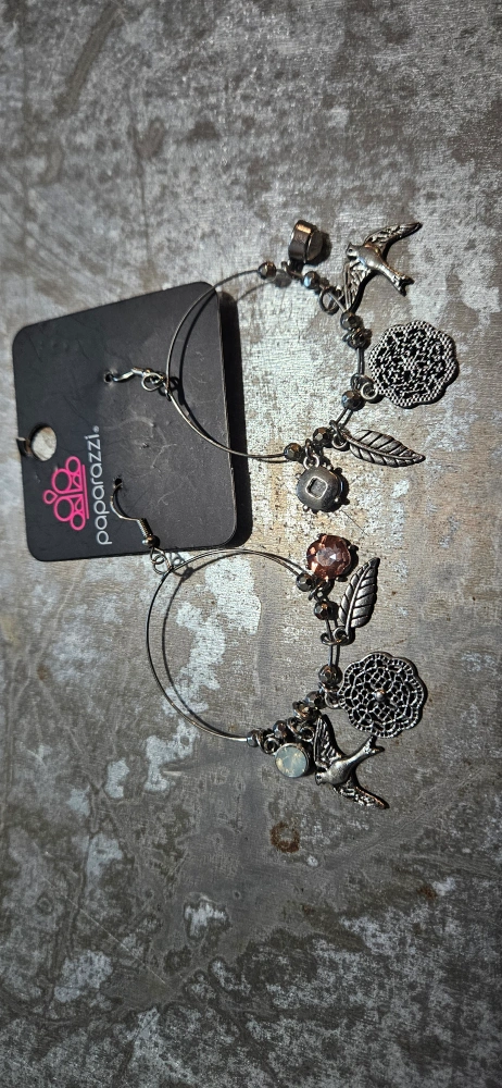 These are a pair of silver hoop earrings from Paparazzi. They feature various charms, including birds, leaves, and floral designs. They're perfect for adding a touch of whimsy to any outfit! makes a great Stocking Stuffer!