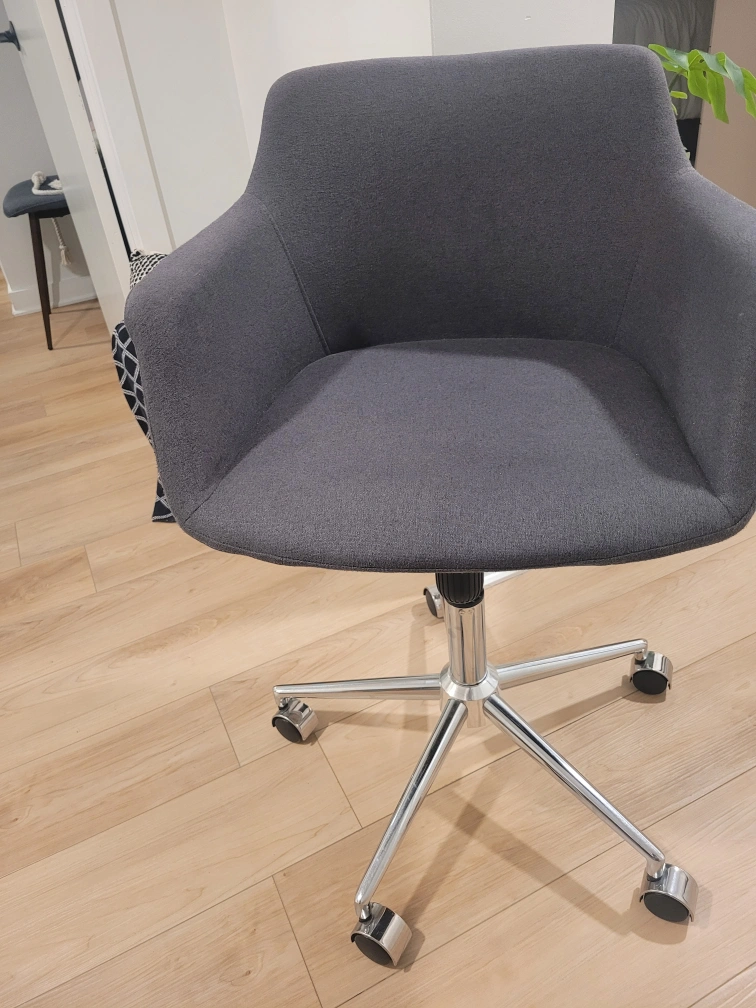 Selling a grey office chair! It's in great shape and ready for a new home office setup. The chair has a sleek design with a sturdy base and smooth-rolling wheels, making it easy to move around your space.