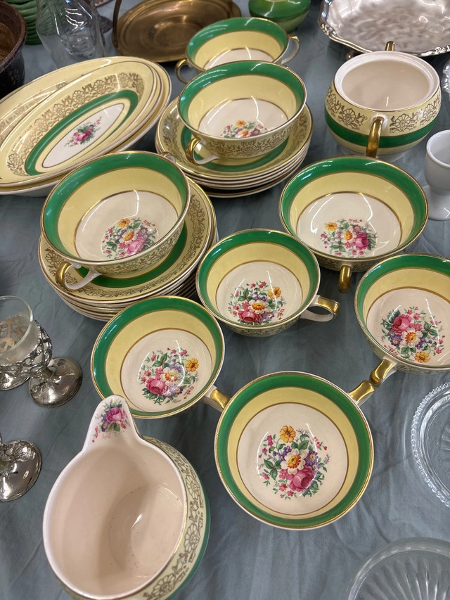 10I'm offering a beautiful set of vintage Pareek Johnson Bros England dinnerware, perfect for adding a touch of elegance to your dining experience. The set includes multiple tea cups, saucers, and serving dishes, all adorned with a delicate floral pattern and gold trim. Please note that this is a used set, and as such, there may be some signs of wear consistent with its age. If you're looking to expand your china cabinet or start a new collection, this set is a steal of a deal. It's like finding a pot of gold, except instead of gold, it's fancy floral dishes! If the ad is up, it's still available!