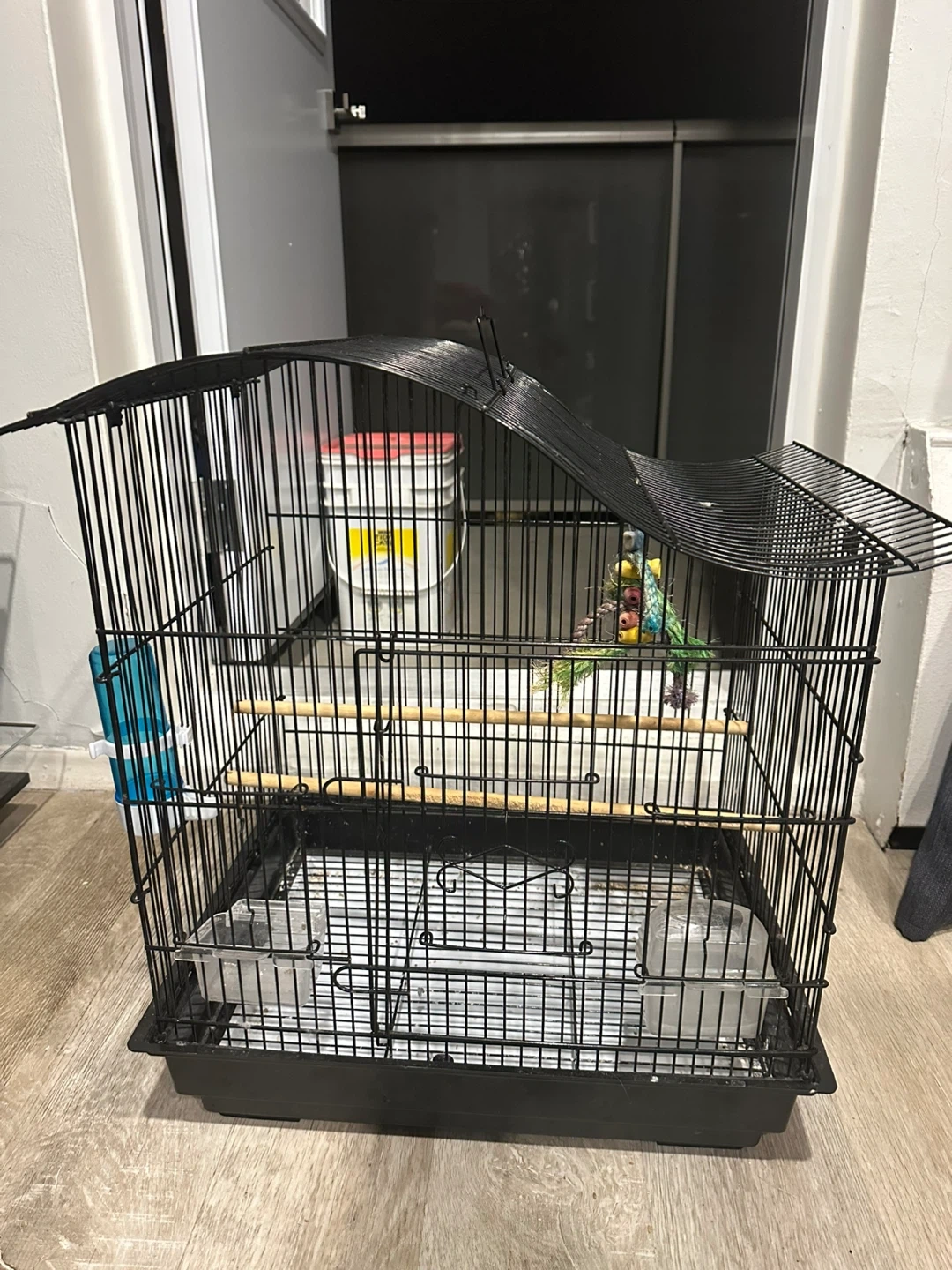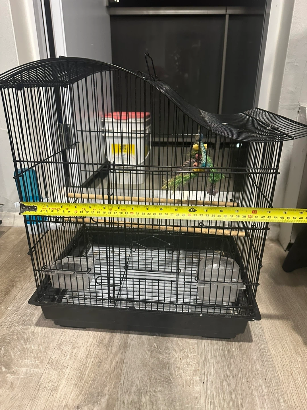 This is a black bird cage. It includes two wooden perches, a water bottle, and some colourful toys. The cage is approximately 22 inches tall and 18 inches wide.