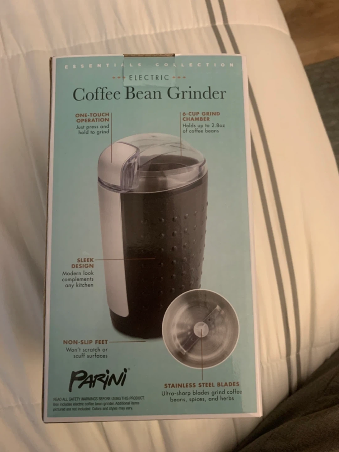 71Selling a brand new Parini Electric Coffee Bean Grinder, still in its original box! It's from the Essentials Collection and features stainless steel blades and one-touch operation. The 6-cup grind chamber holds up to 2.8oz of coffee beans. It also has a sleek design with non-slip feet. Ultra-sharp blades grind coffee beans, spices, and herbs