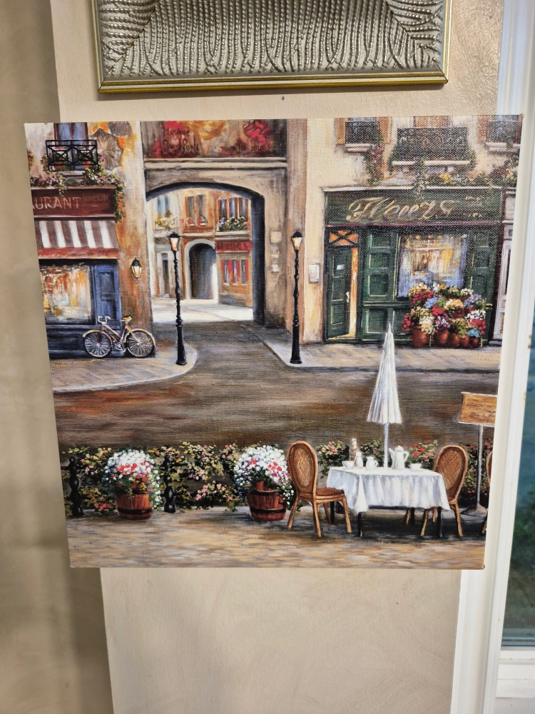 Lovely canvas print depicting a charming Parisian cafe scene. The artwork features a restaurant, flower shop, and a quaint outdoor seating area. It's perfect for adding a touch of European flair to any room! Delivery possible for $20 within 25 Km.