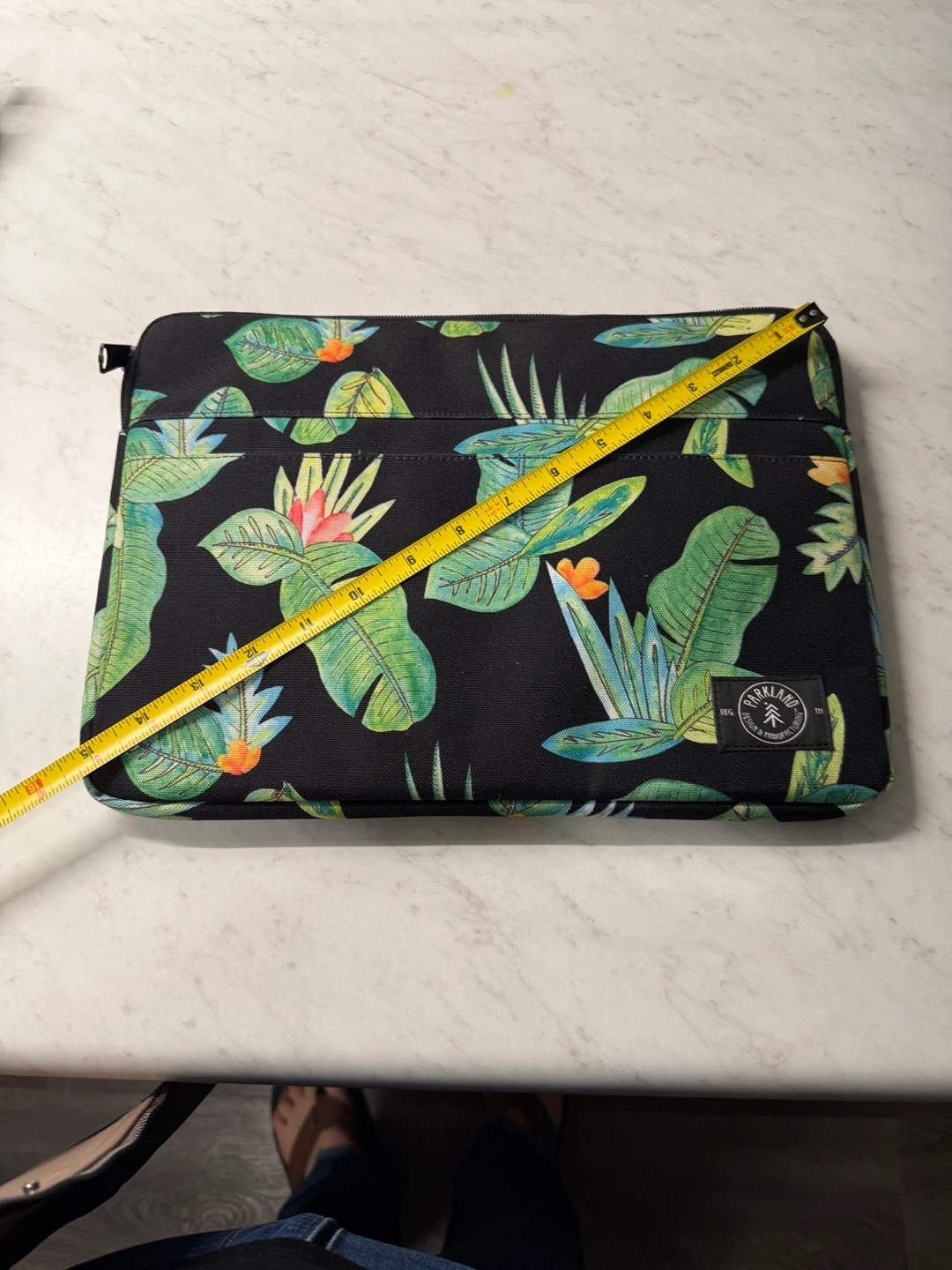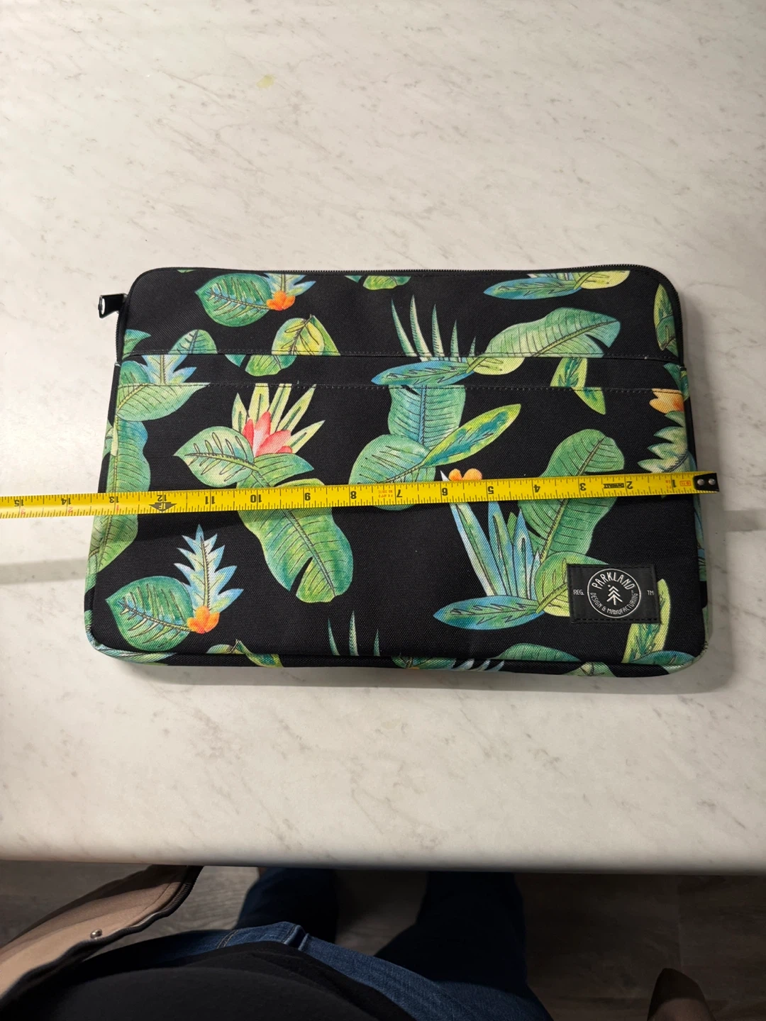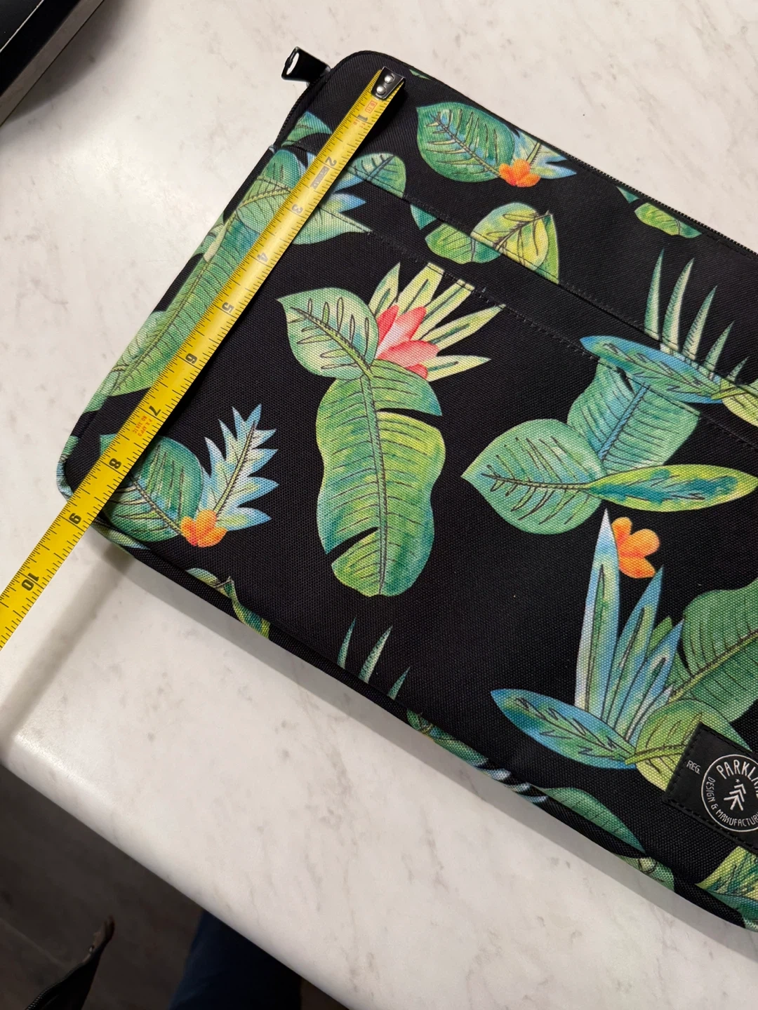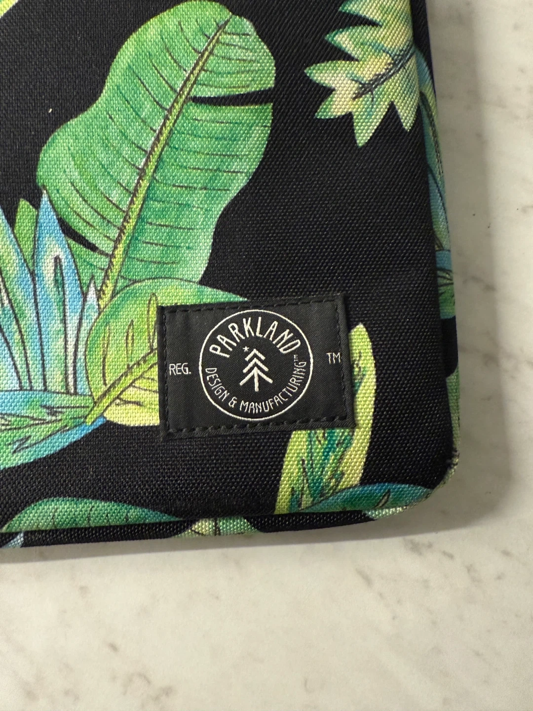 10Selling a Parkland laptop sleeve that fits a 14-inch laptop. The sleeve features a fun tropical leaf print on a black background. It's in great condition and ready to protect your laptop!