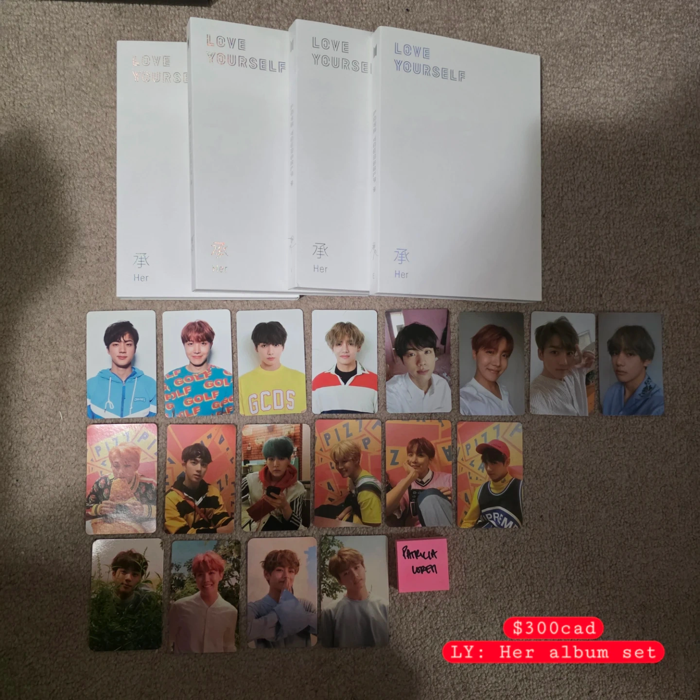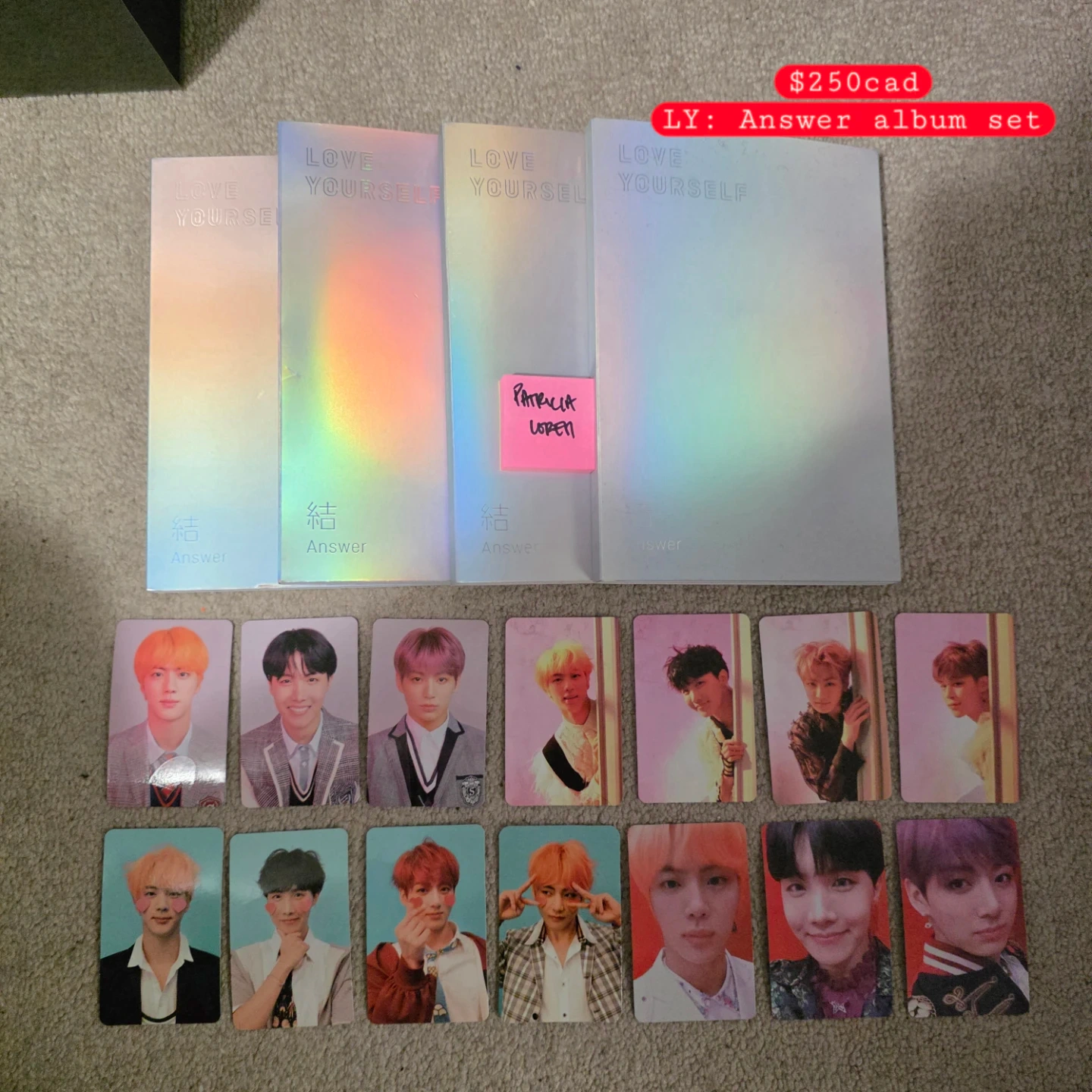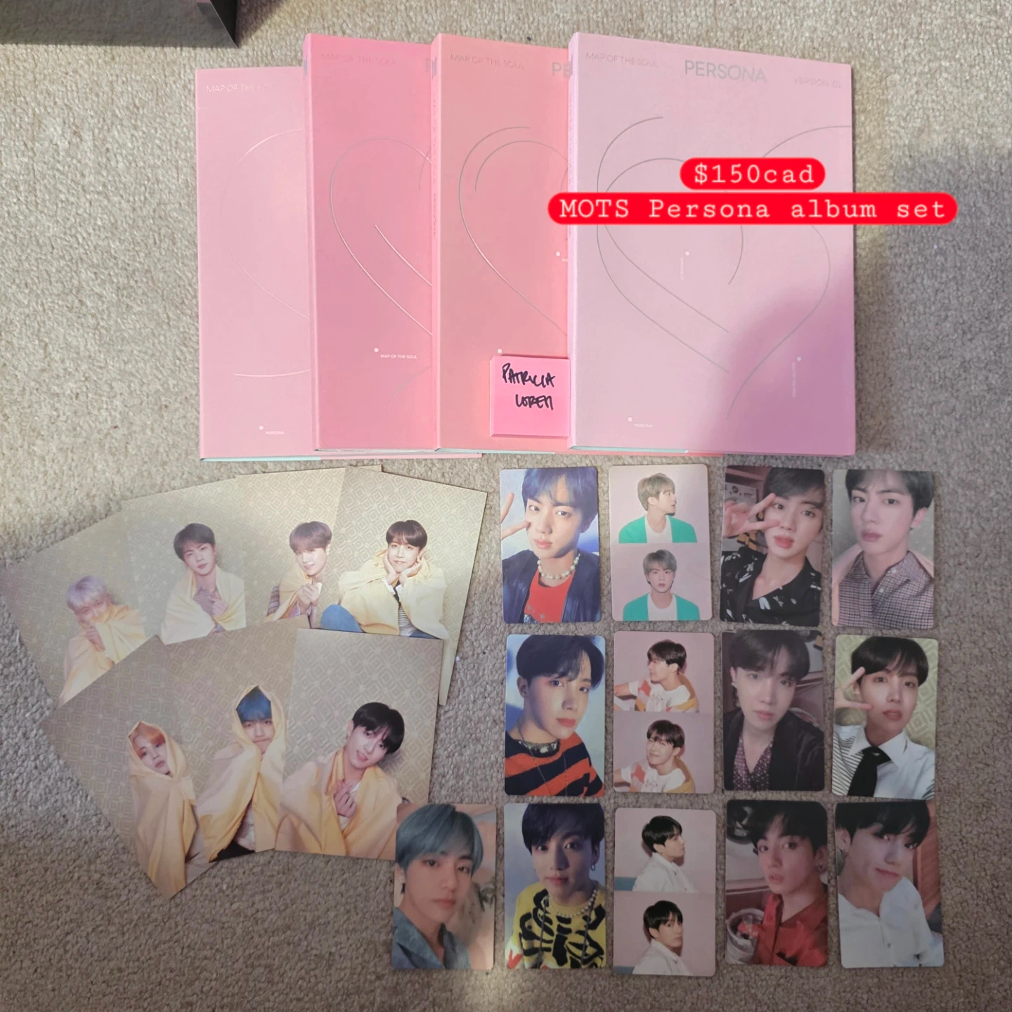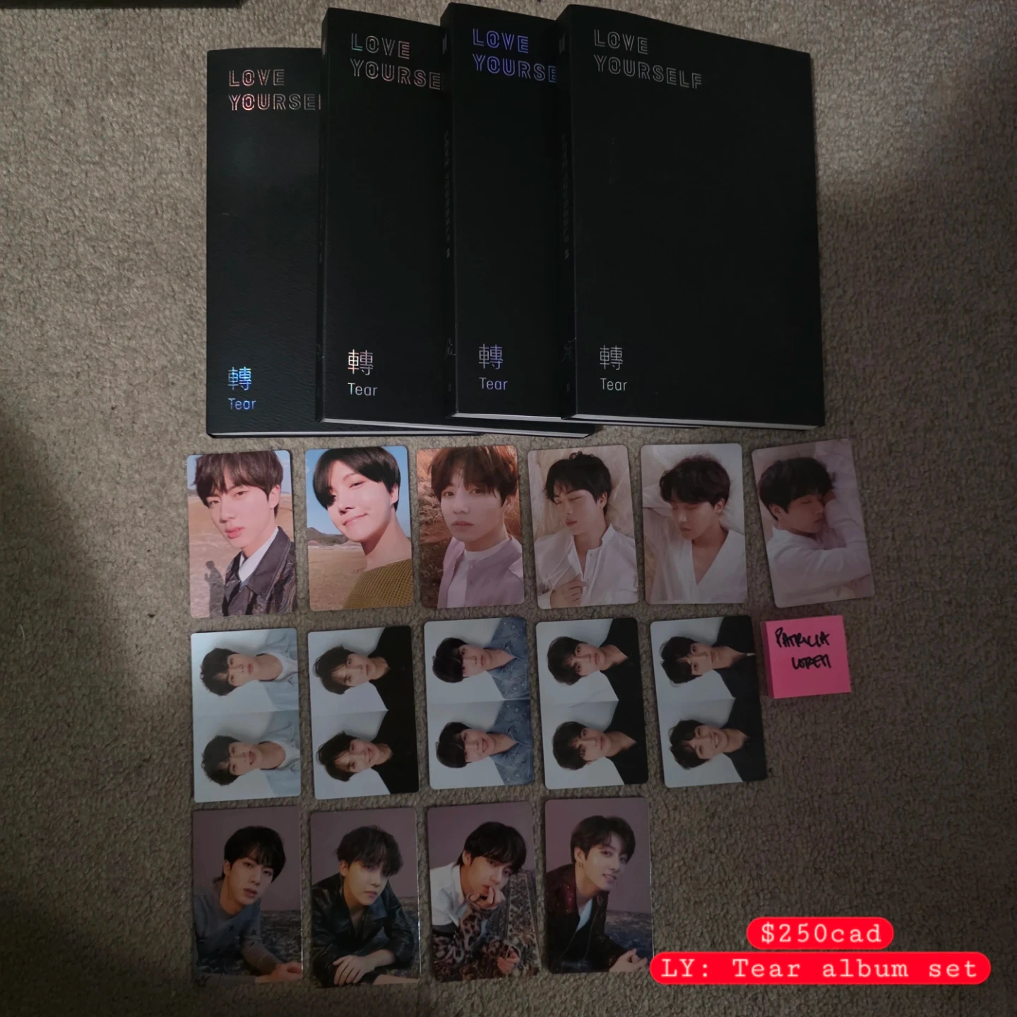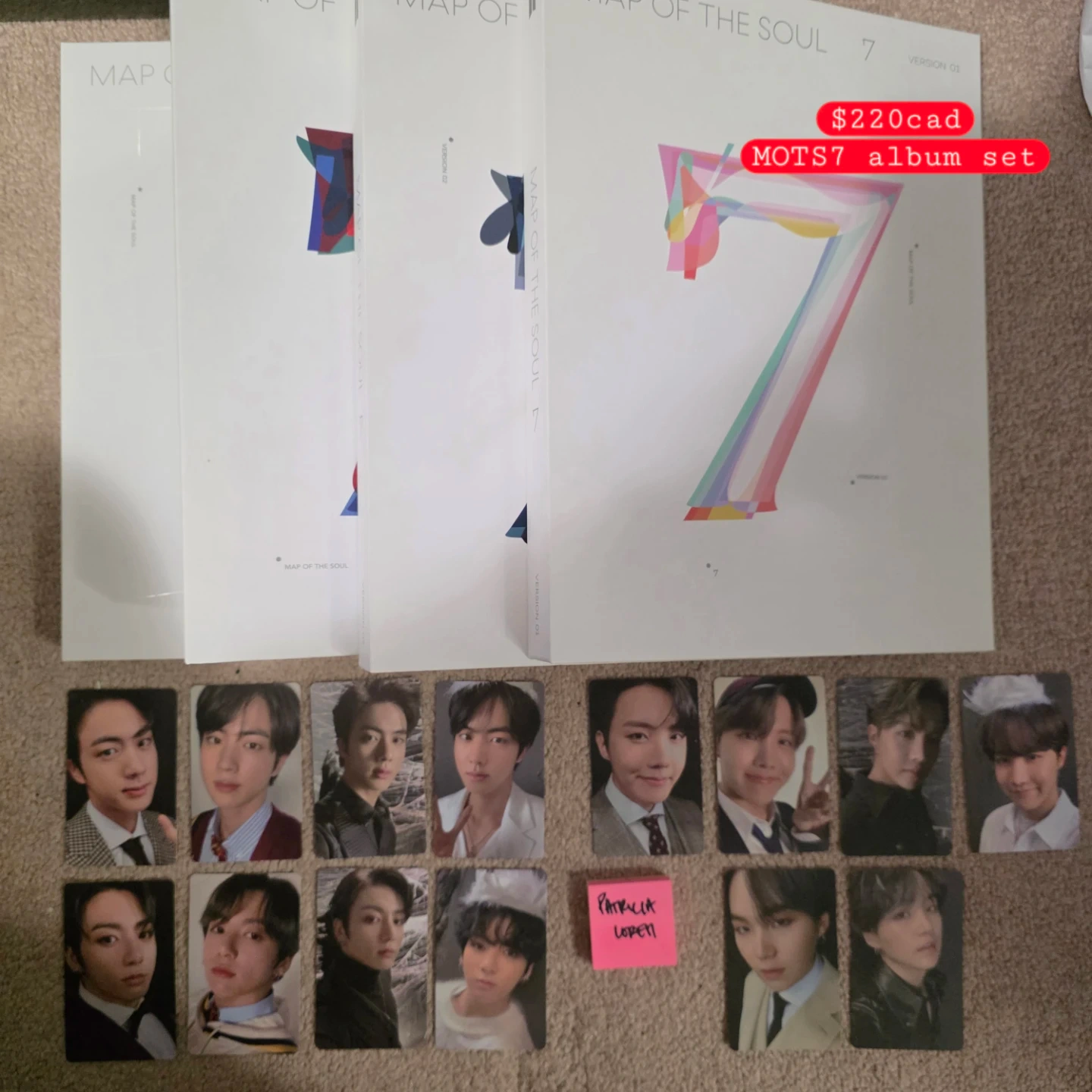 75Prices in each picture + shipping All in CAD Please read these carefully: - I collect Jin, Hobi and JK so the pcs will definitely have the full sets for them (some has Jimin and V too since I had a time when I was collecting the maknae line) - Each picture has the pcs ur getting for that album set - Other album inclusions will likely be included inside the album as I didnt take anything out except for pcs and postcards - Will not send videos of pc conditions~ sorry there's just too many~ these are stored sleeved in my binder~ some will have its little scratch marks for the matte ones but not too noticeable~ will disclose any concerning damage if a pc or album has one - For full disclosure... my photocards are a mix of old (most of them) and new versions so the pc size, color of backing, edges and cut might be different with each other but I can guarantee they're NOT fake as I've pulled a lot of them myself (especially JK's pcs.. I'm a JK magnet 🤭) - I priced these based off market value, current price of the albums and mercari prices~ please don't buy if ur not okay with it 🫶 I can give a discount if ur getting 2 or more album sets 🫶 ▶️Payments: Etransfer or Paypal F&F only ▶️Local meetups are okay within Metro Vancouver ▶️Can ship at buyer's expense (shipping from Canada) ▶️Will disclose my IG for my proofs on dm. Thank you!