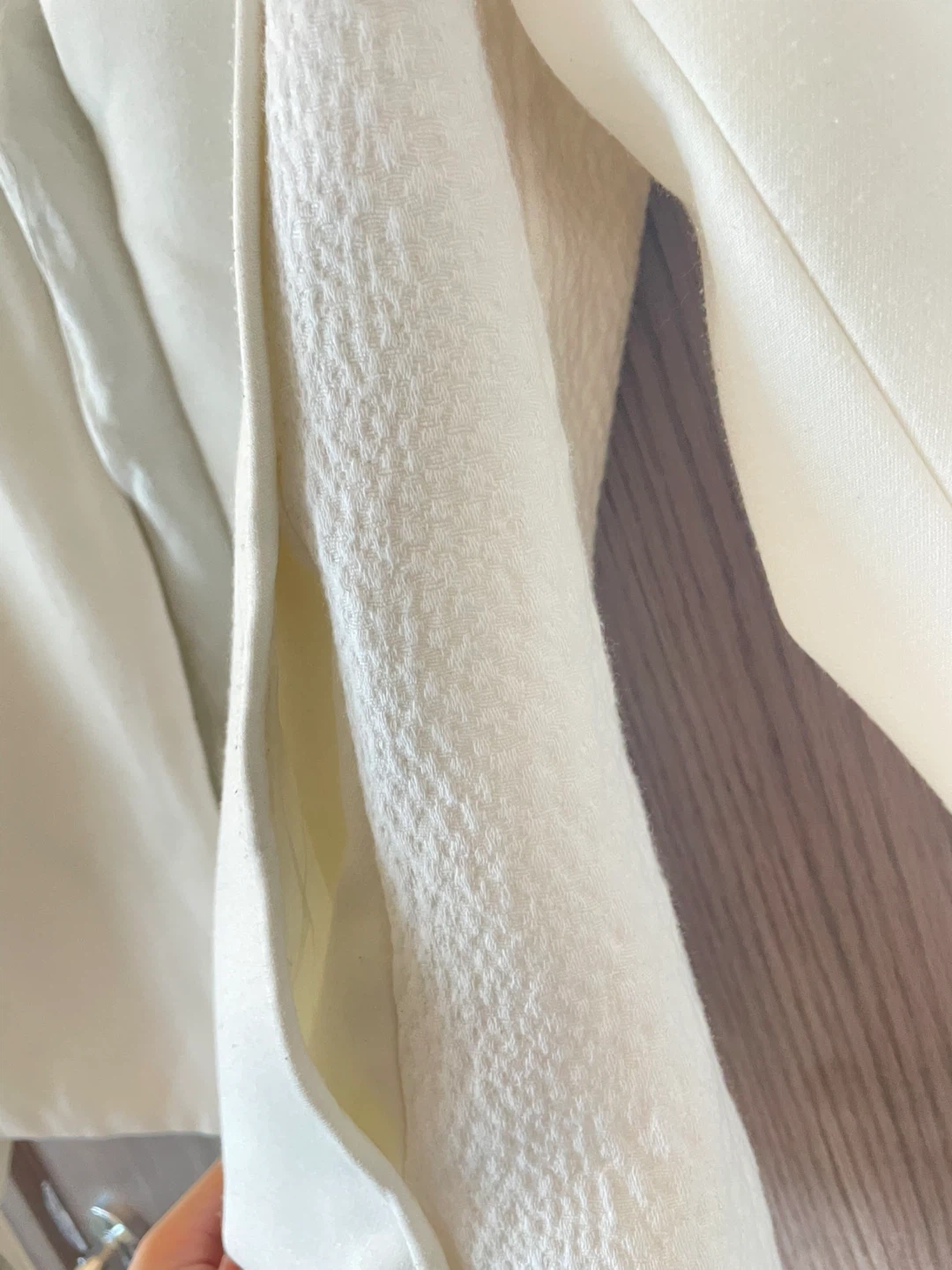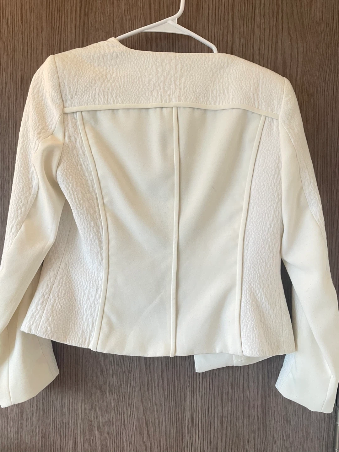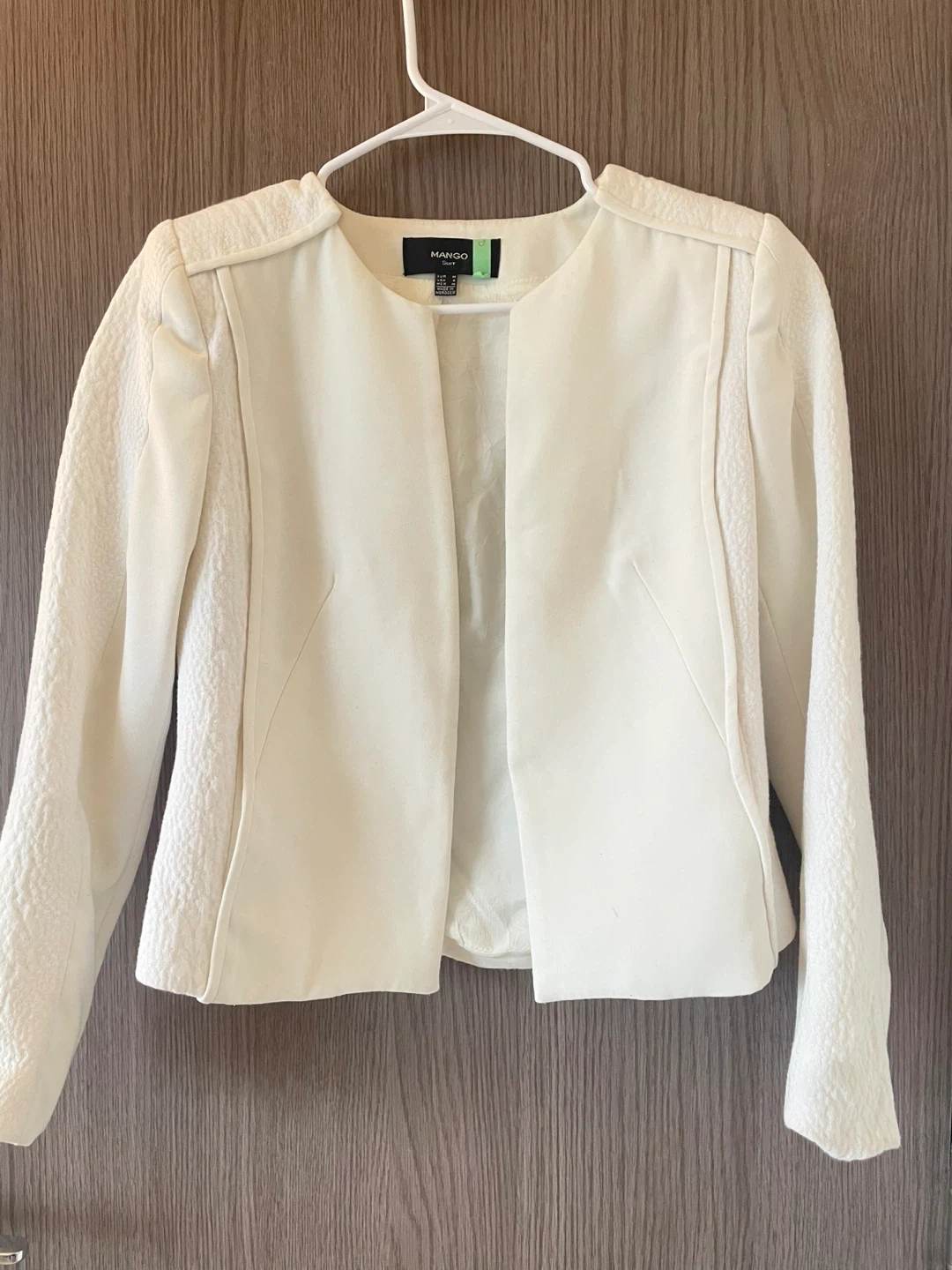 Stylish white blazer from Mango. It has a textured panel on the shoulders and sleeves. This jacket is perfect for dressing up an outfit for a night out or a professional setting. Comes with 2 pockets. It's a size small but fits medium.