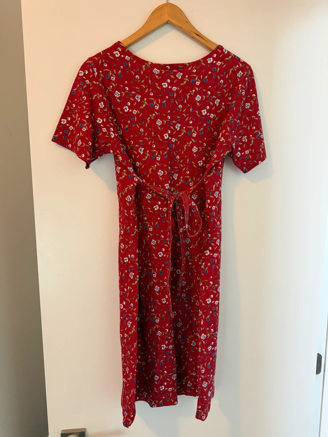 Sweetwater Creek vintage dress with a red floral print. Made in Canada from 100% cotton. This dress has short sleeves and a tie at the back. It fits a small or medium (the tie makes the sizing forgiving).