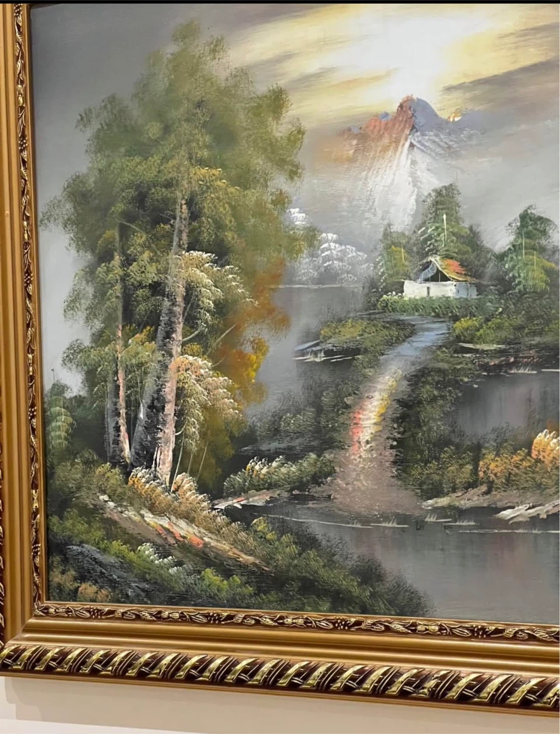 This is a framed oil painting depicting a serene landscape scene. It features a cabin nestled amongst trees with a mountain backdrop and a reflective body of water. The artwork is ready to hang.