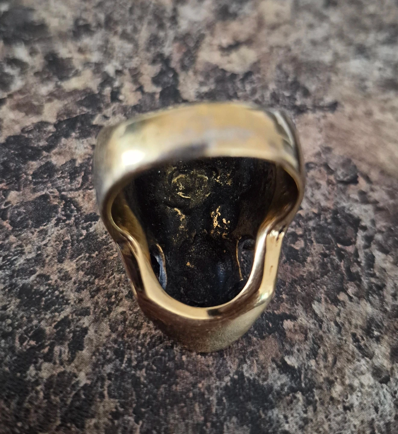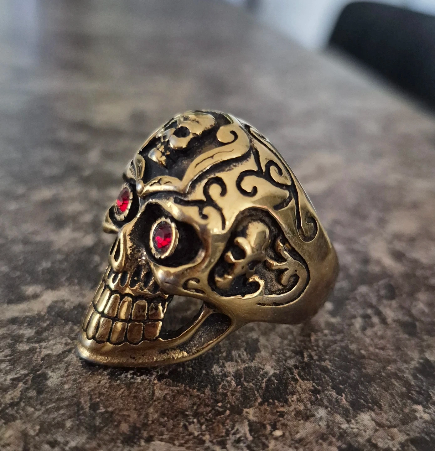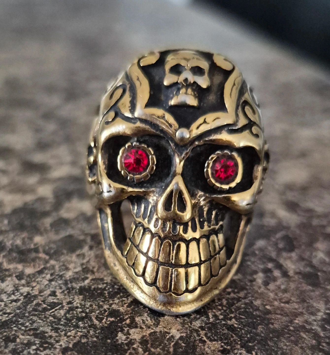 A striking skull ring featuring ornate scrollwork and two vibrant red gemstone eyes. It's made of a gold-toned metal, likely brass, and has a substantial feel. This ring is a statement piece for anyone who appreciates gothic or biker-inspired style.