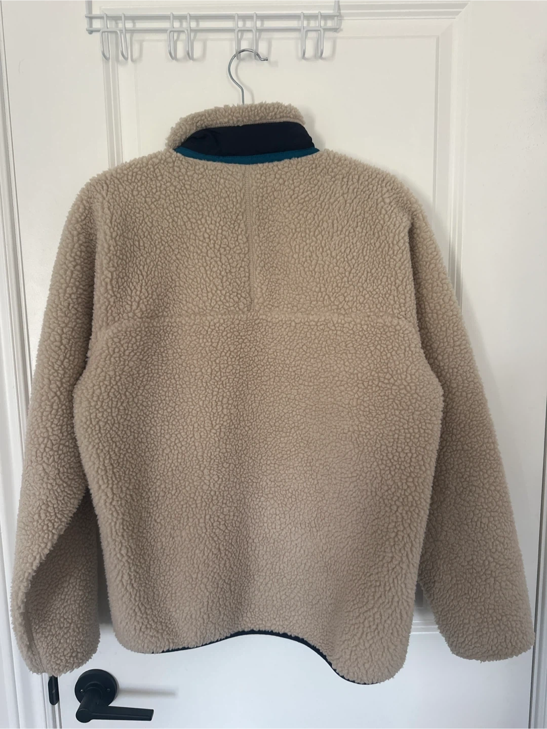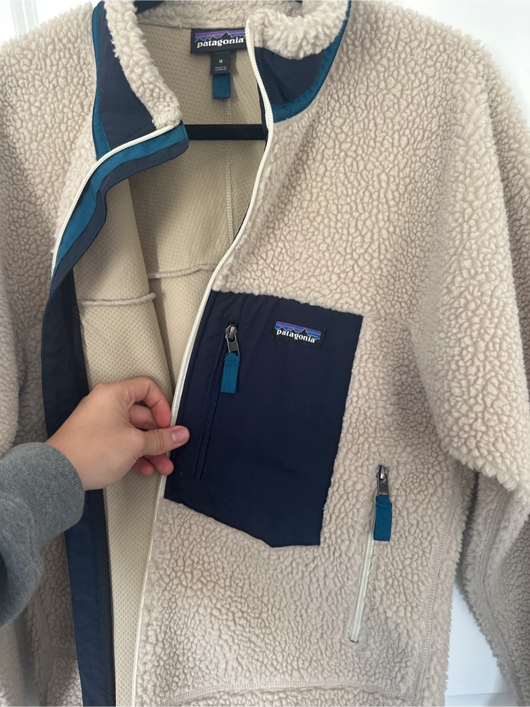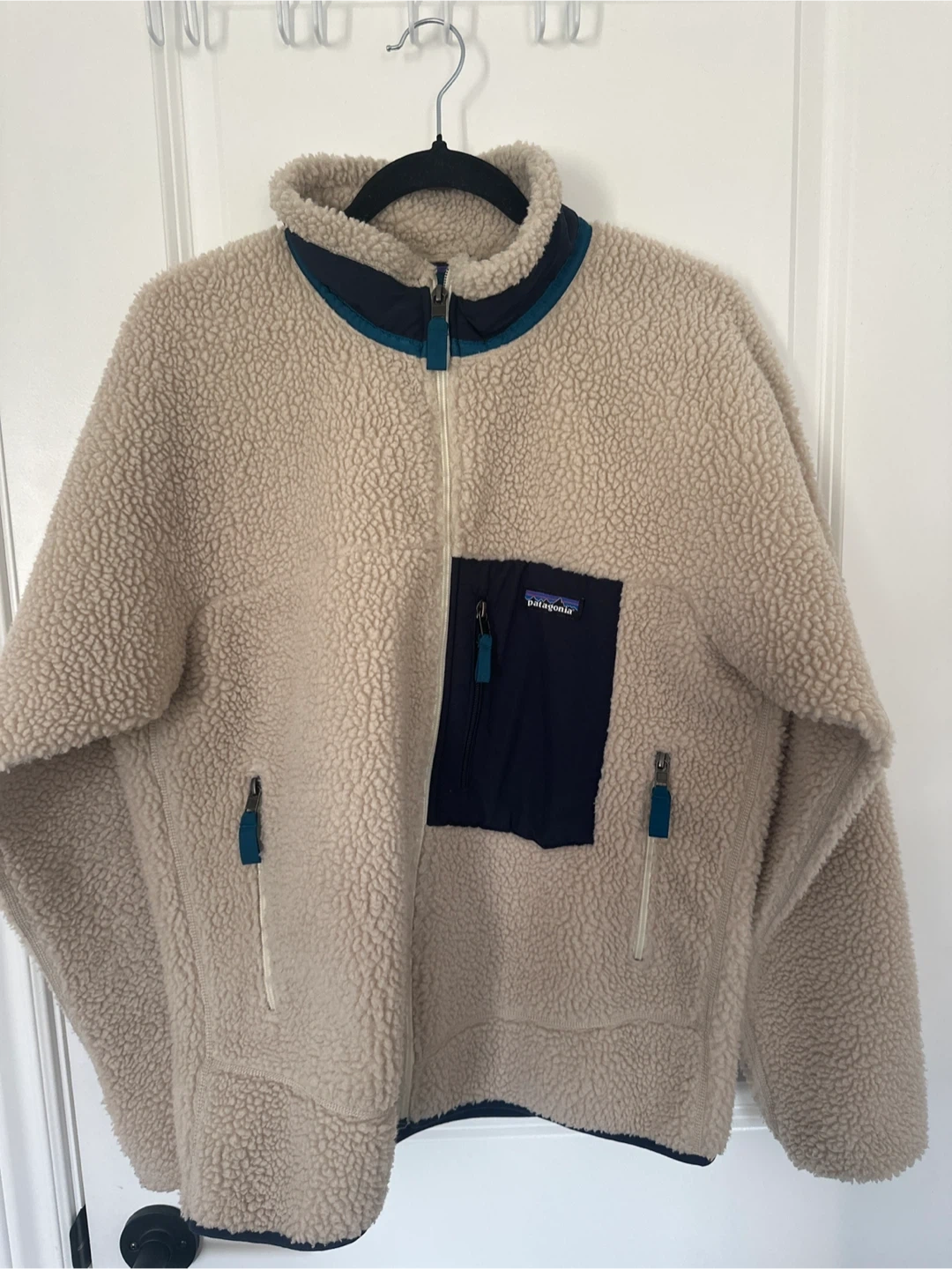 Cozy up with this Patagonia Retro Pile fleece jacket! It's a size medium and in great condition. Perfect for layering or wearing on its own during those chilly Canadian days. The fleece material is super soft and comfy, and the jacket features a handy chest pocket with the Patagonia logo. A great addition to any wardrobe!