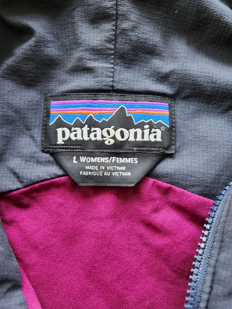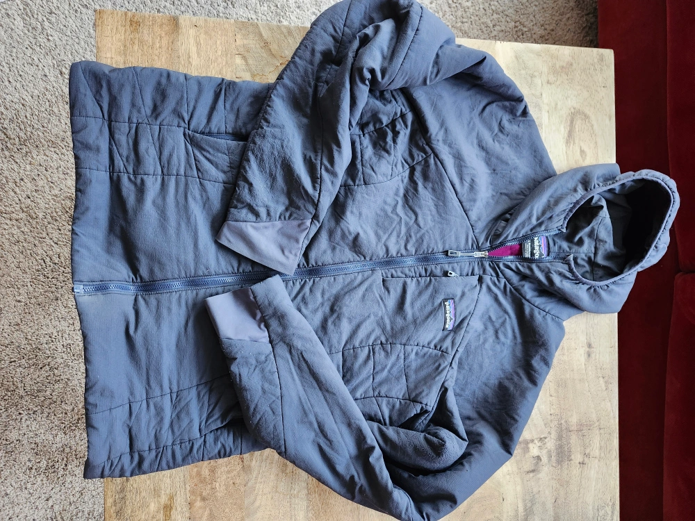 49Warm Patagonia jacket. Breathable, and its synthetic insulation is better than down for active use. Features a hood and zipper closure. Excellent for layering. Size large. Doesn't fit me anymore.