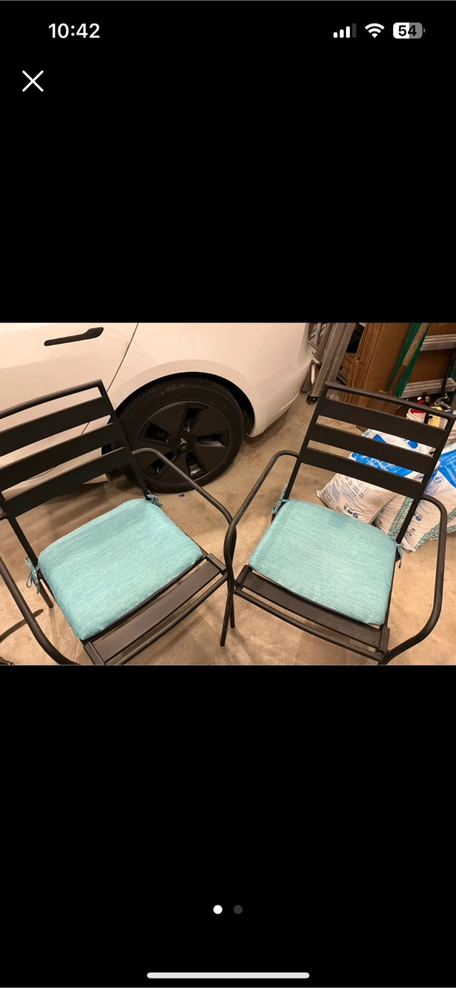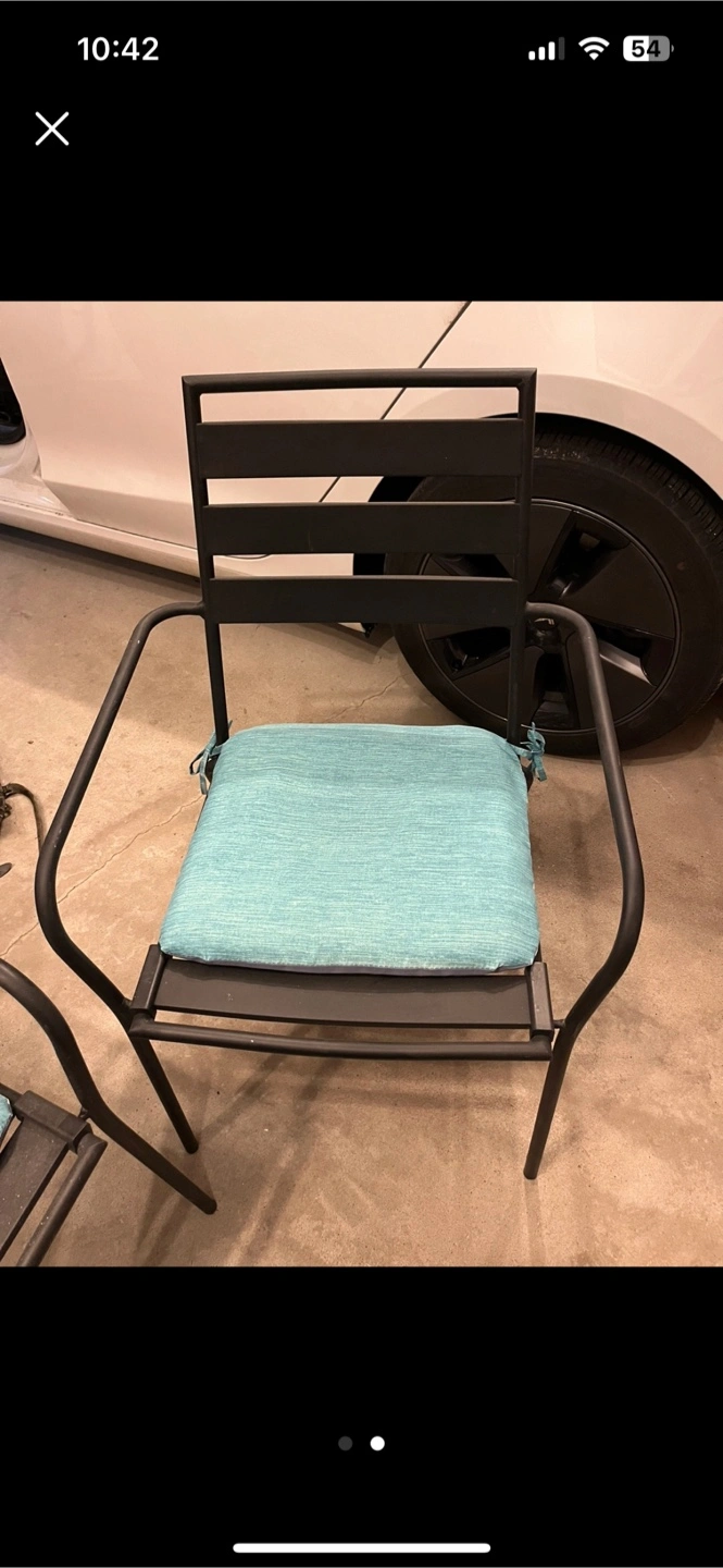Selling a set of two patio chairs, perfect for your backyard or balcony! They come with comfy cushions, ready for you to relax and enjoy the outdoors. The chairs are in good condition and ready for a new home.