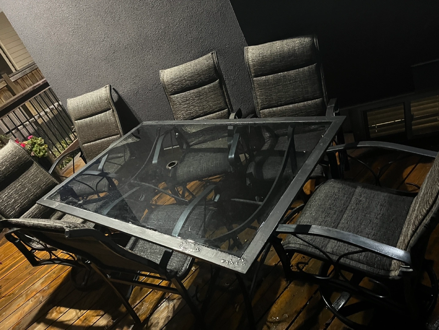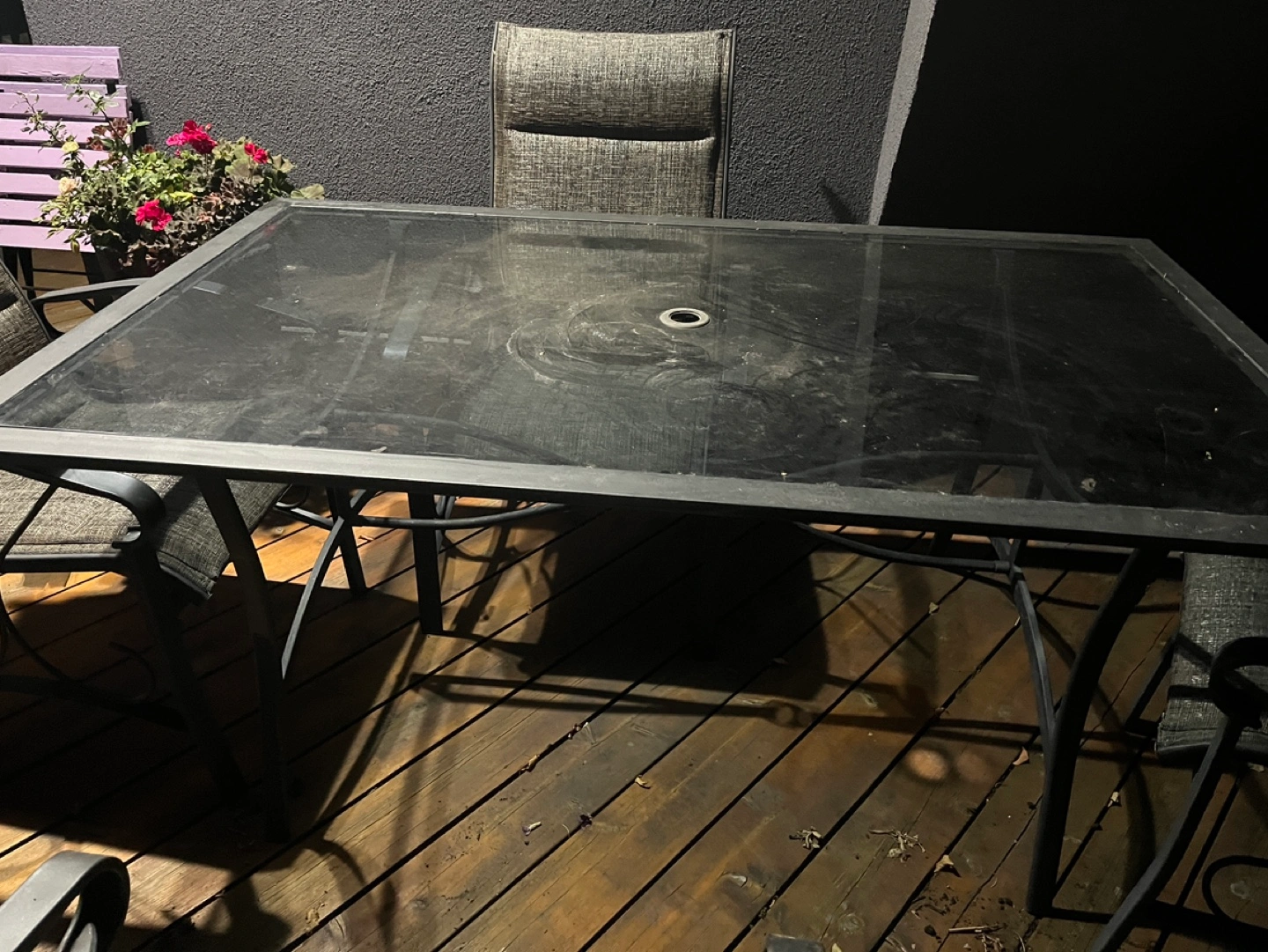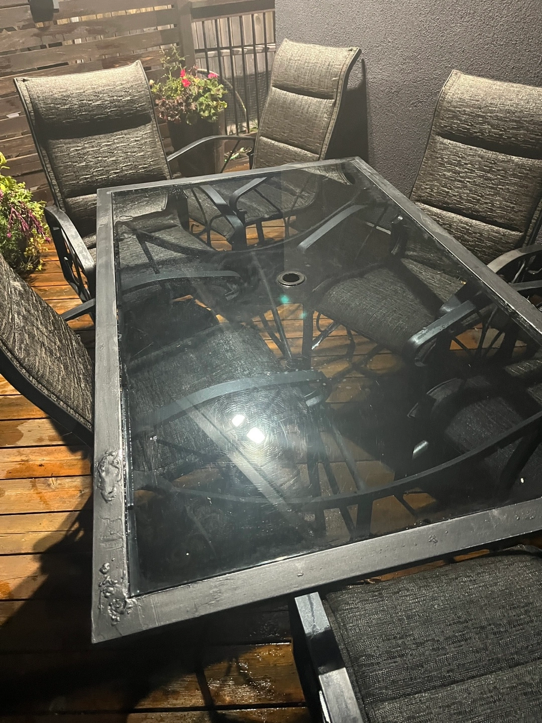 25Glass top table with six chairs. Black metal frames. Brown fabric cushions. Free but must pick up