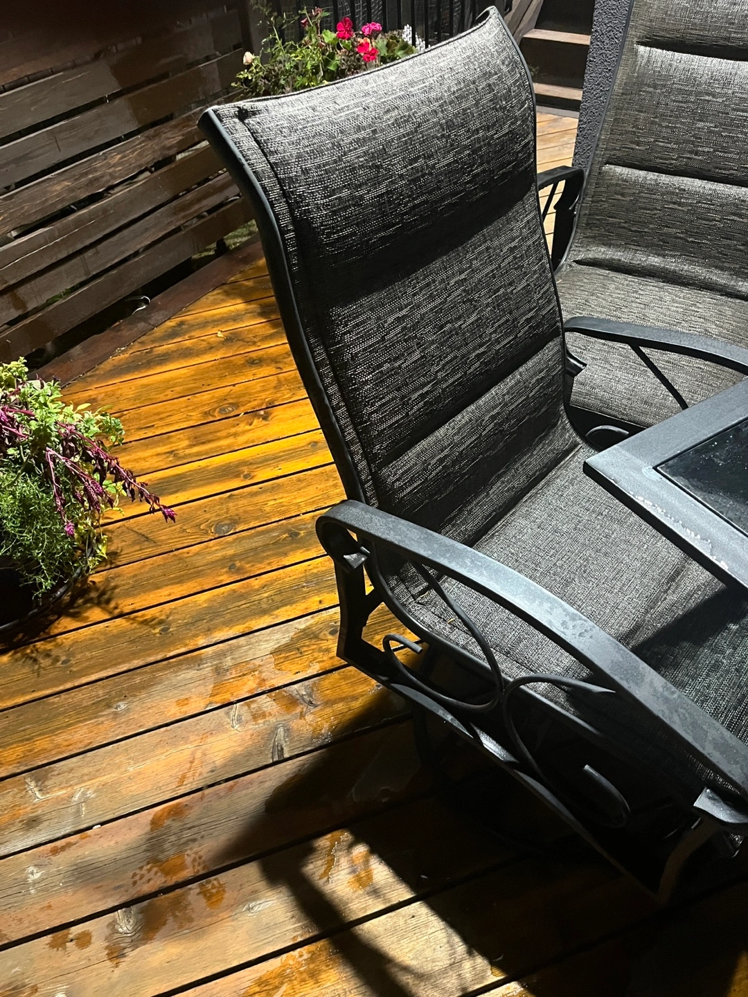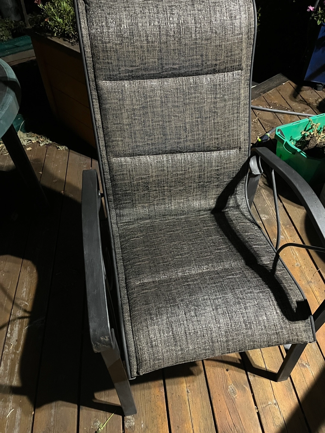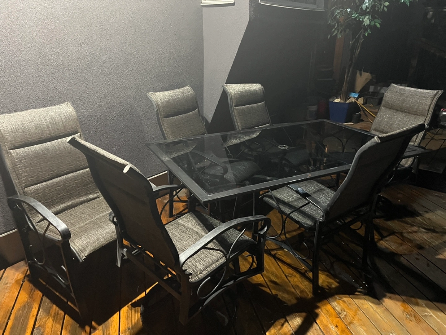 25Glass top table with six chairs. Black metal frames. Brown fabric cushions. Free but must pick up