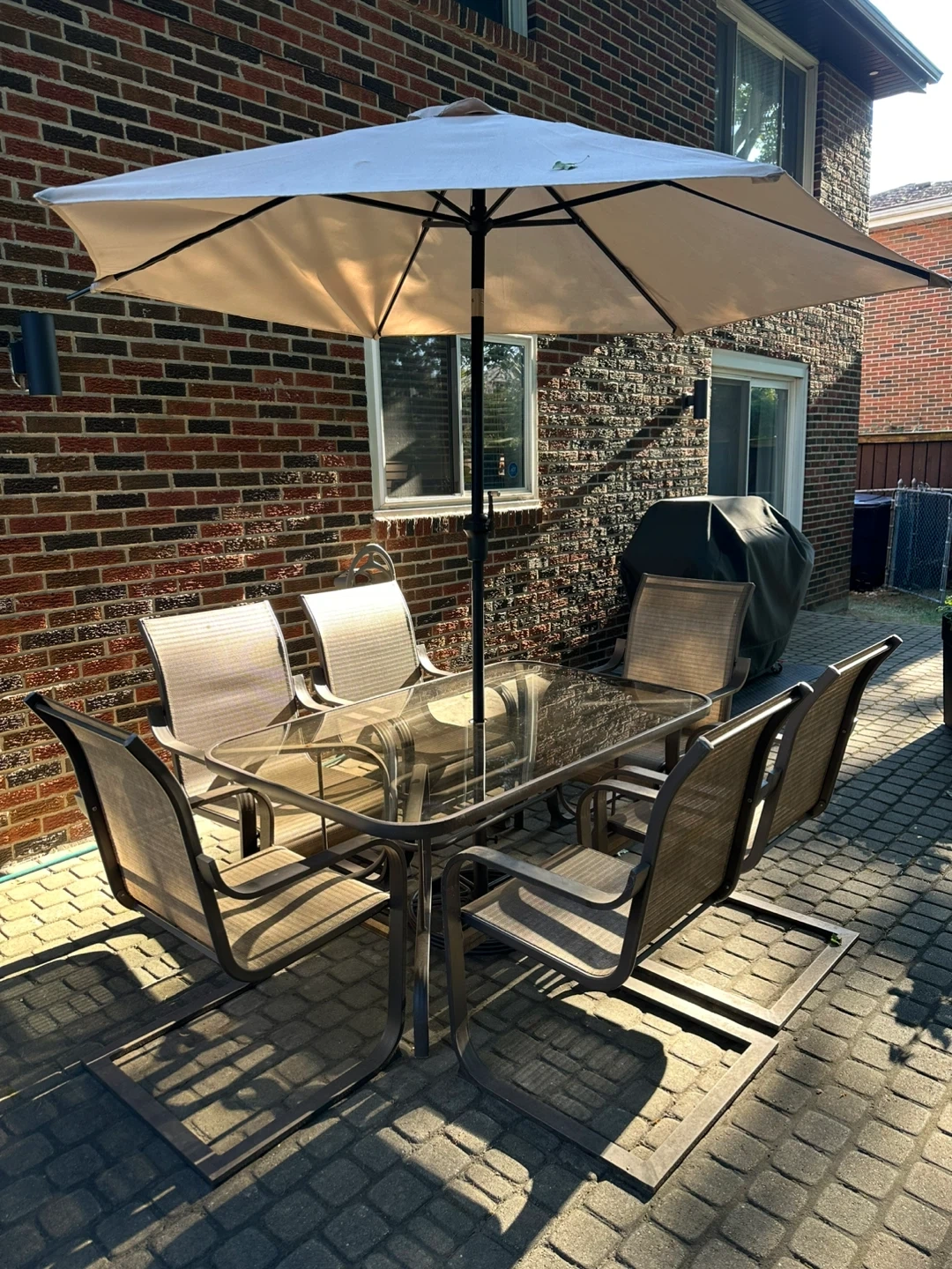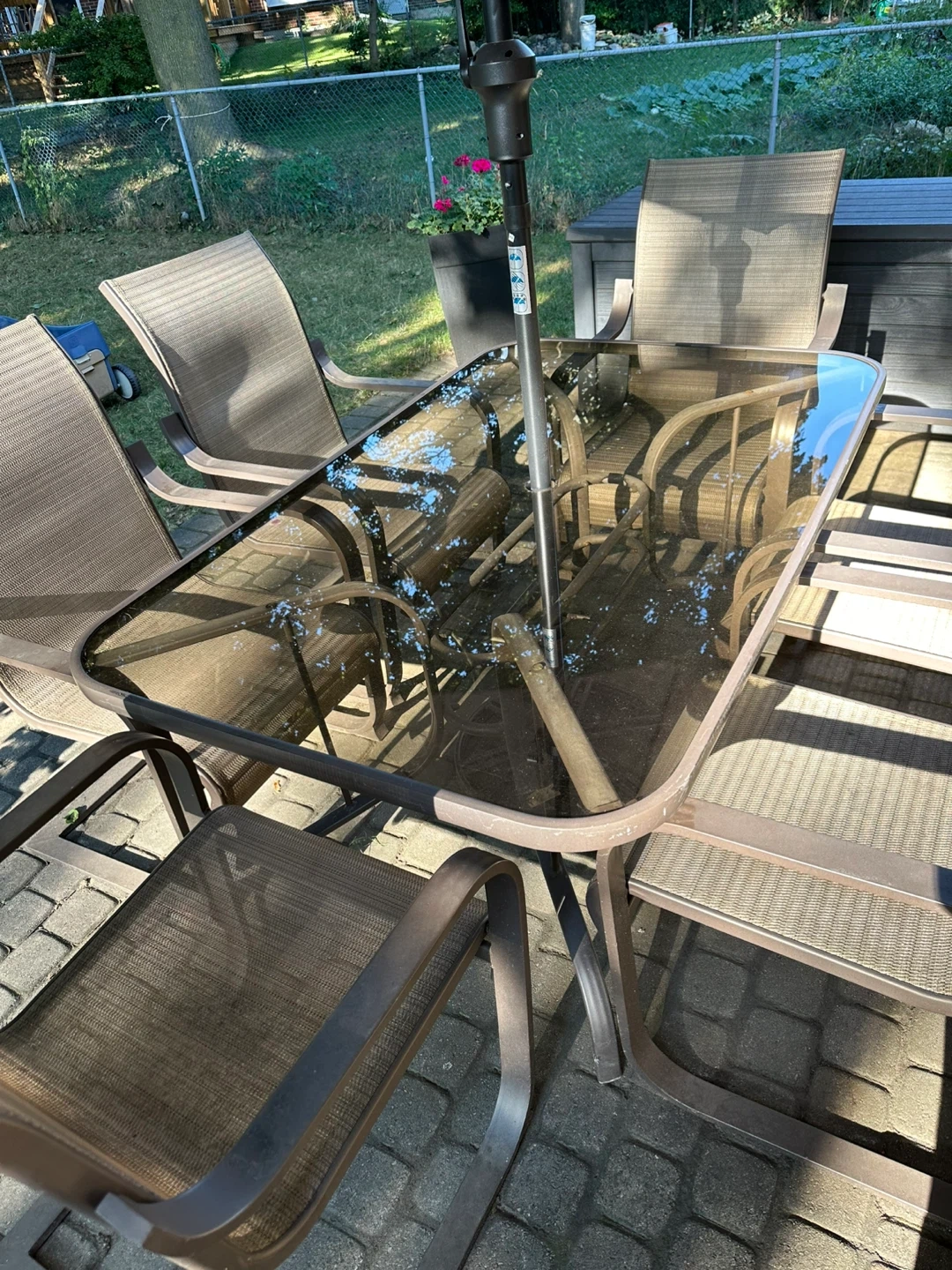 Selling a patio dining set that includes a glass-top table, a large umbrella, and six chairs. The set is in good condition and perfect for outdoor dining and entertaining. The chairs are comfortable and the umbrella provides ample shade on sunny days. Great for your backyard or patio!