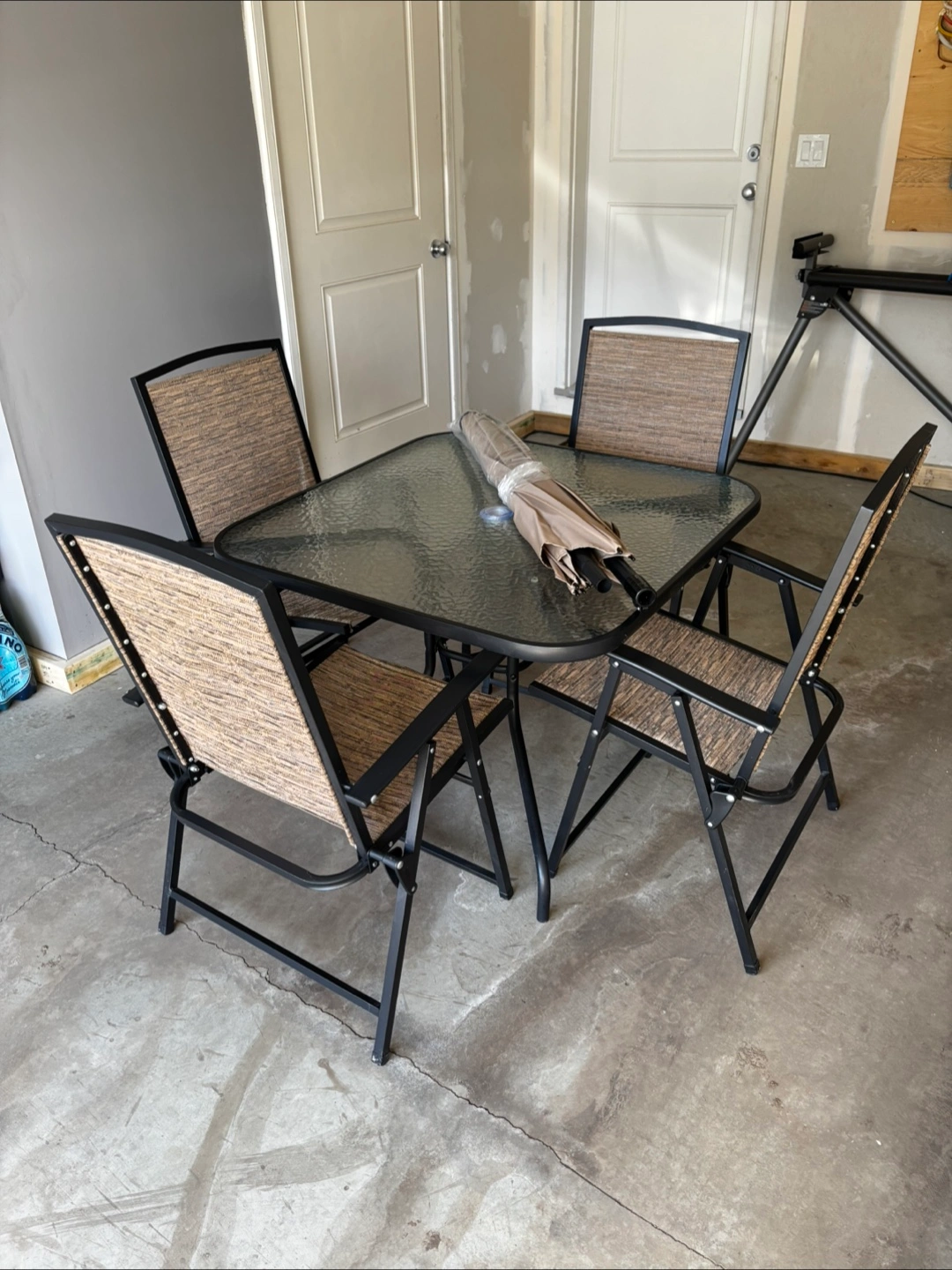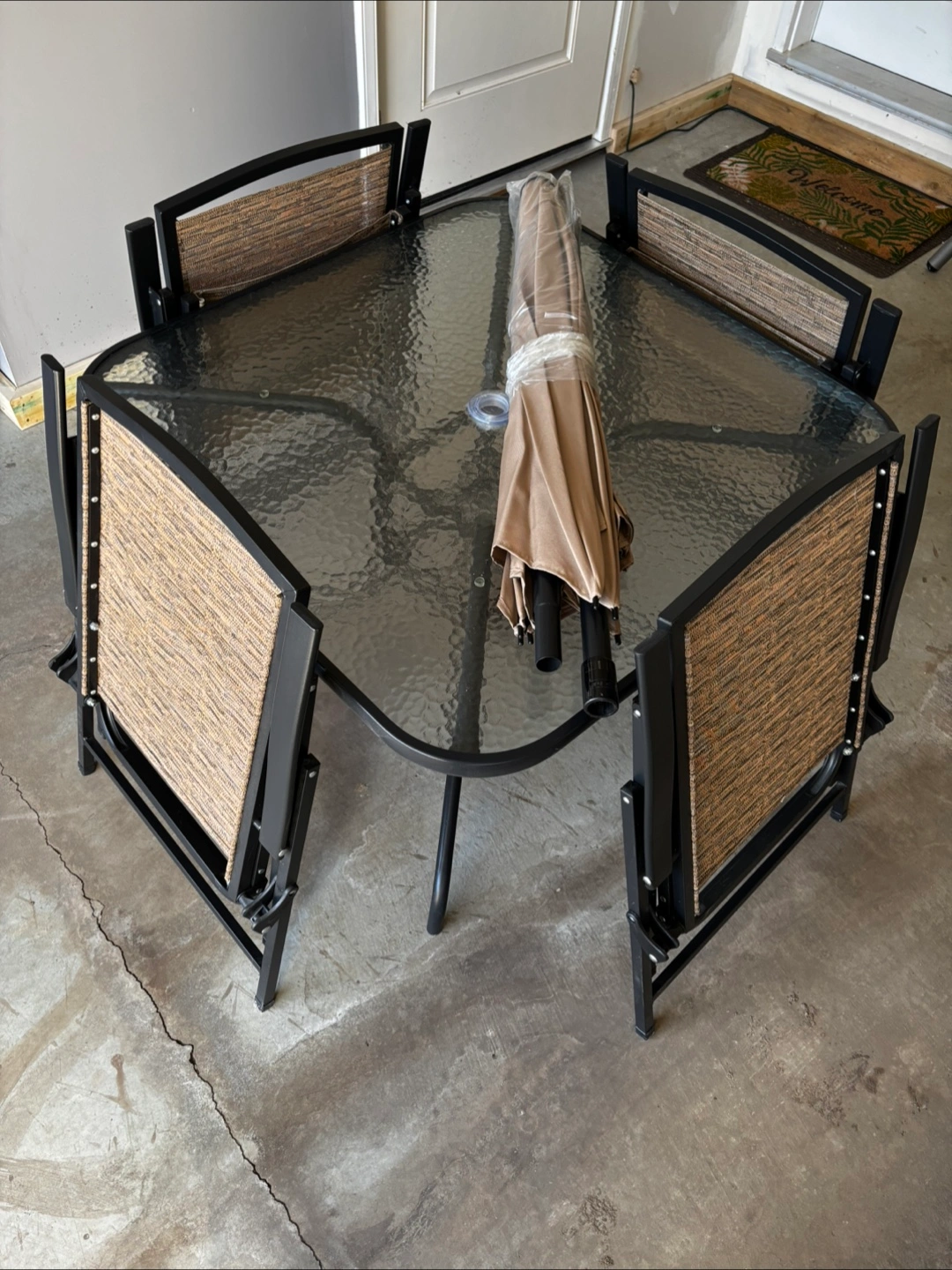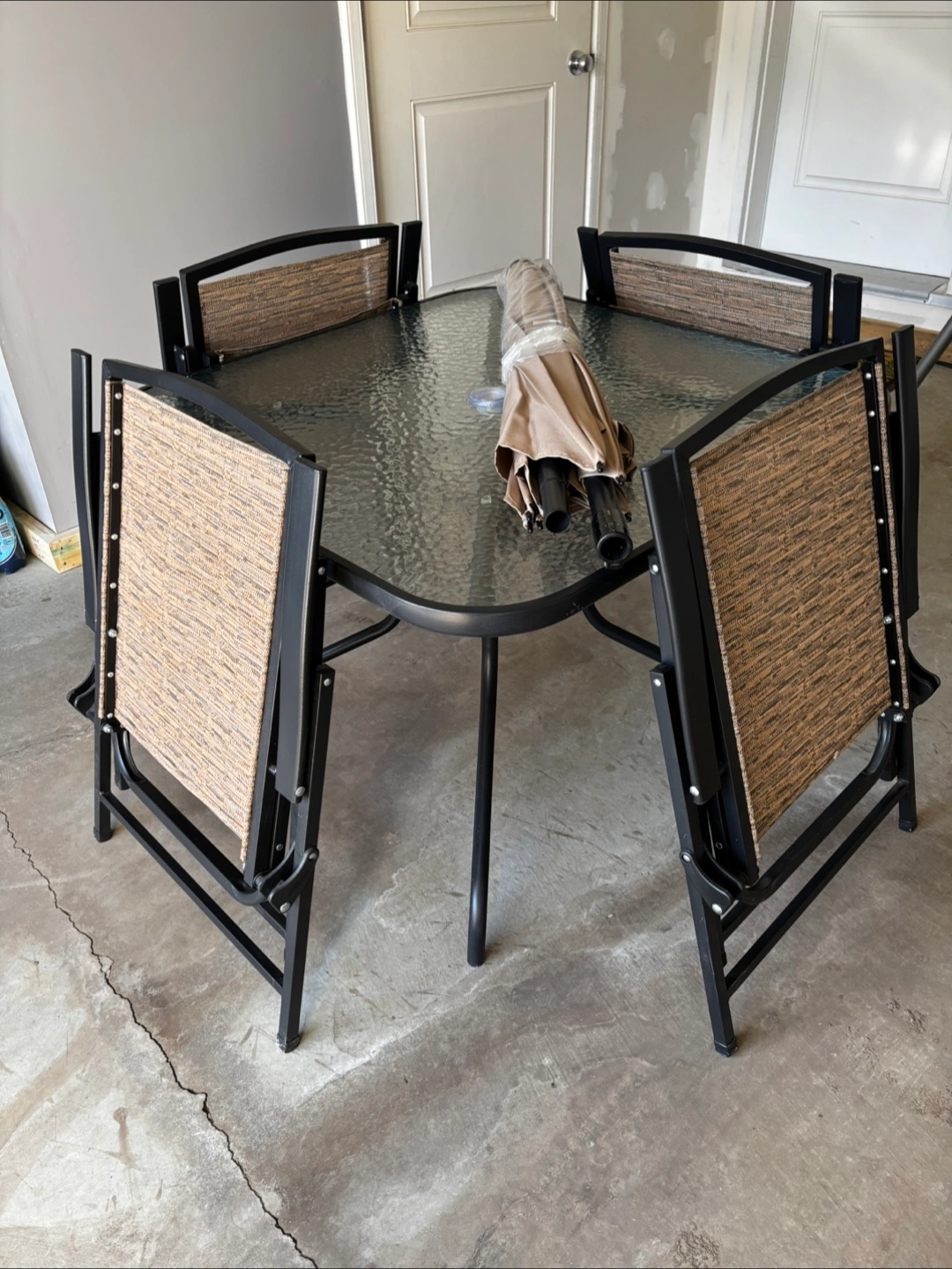 5Foldable patio chairs. Glass-top square table. Beige and brown woven chair seats and backs. Includes an umbrella (never used). Metal frame.