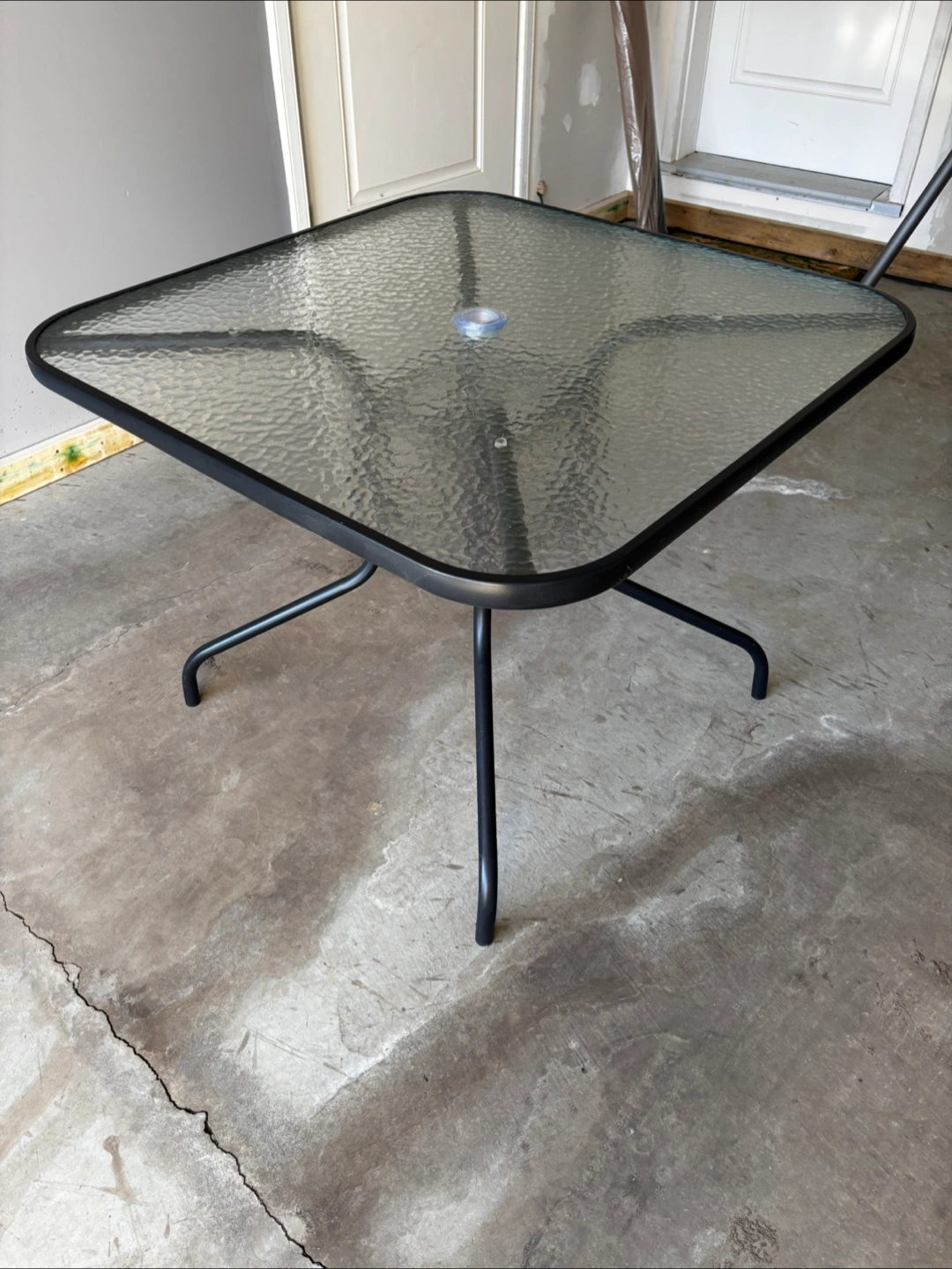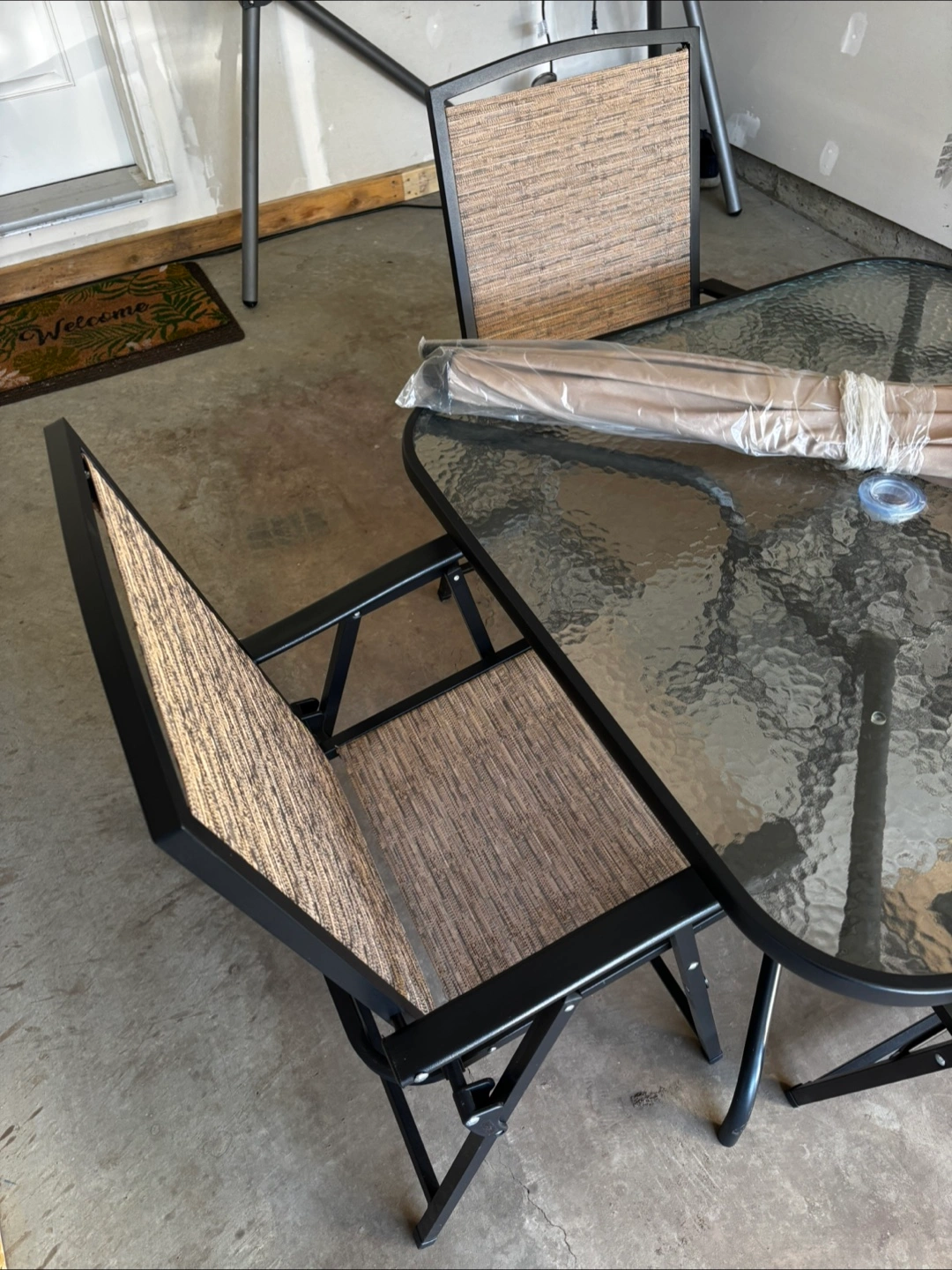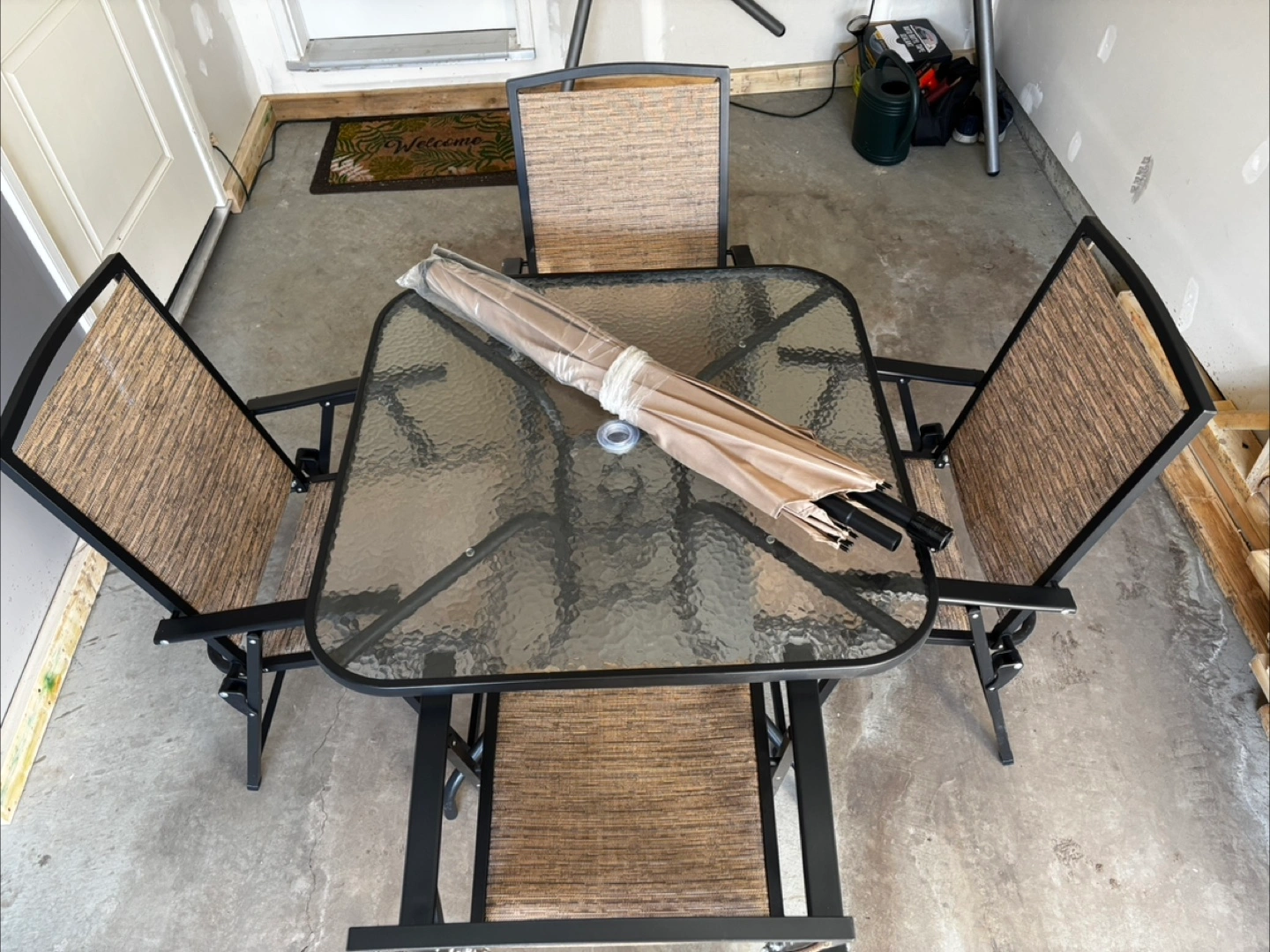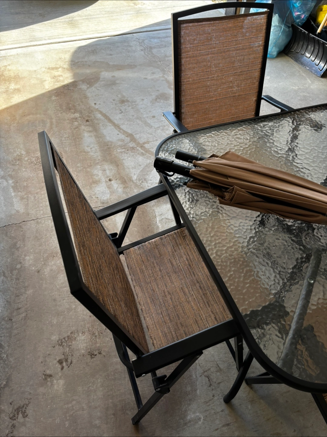 5Foldable patio chairs. Glass-top square table. Beige and brown woven chair seats and backs. Includes an umbrella (never used). Metal frame.