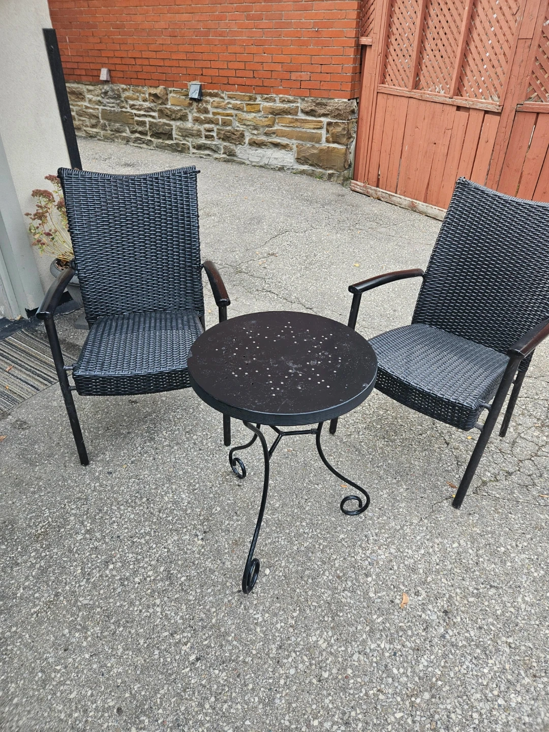 38Selling a cute patio set that includes two chairs and a small table! It's perfect for a small balcony or garden area. The chairs are made of a black wicker material and have armrests. The table is black as well and has a decorative design on top. Great for enjoying your morning coffee or a summer evening!
