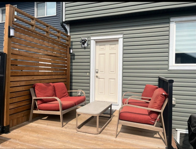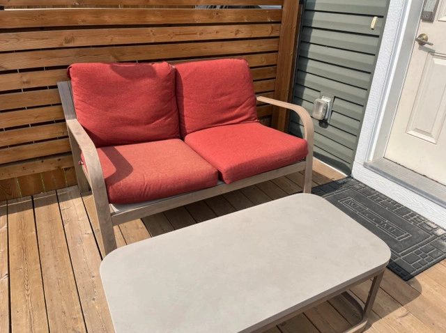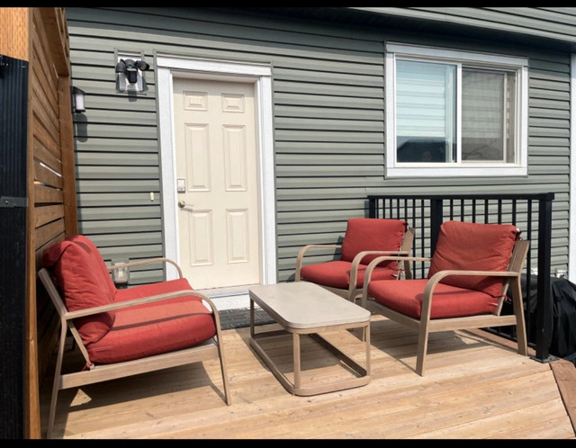28Enhance your outdoor living space with this charming used patio set! It includes a cozy loveseat, two comfortable chairs, and a sleek coffee table, perfect for enjoying sunny afternoons or relaxing evenings. This set has been lovingly used but remains in good condition. Here are the specifications: * Includes: Loveseat, 2 chairs, and coffee table * Cushion Colour: Reddish-Orange * Frame Material: Metal Based on recent Kijiji listings, a similar used patio set is typically priced between $200 and $400. I'm pricing this set competitively at the higher end due to its well-maintained condition and stylish design. If the ad is still up, it's still available! Cash Only