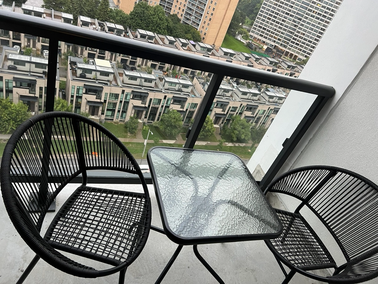 15Set includes a table with a glass top and two chairs. Chairs are made from a woven material and have a black metal frame. Like new. Pick up in Etobicoke