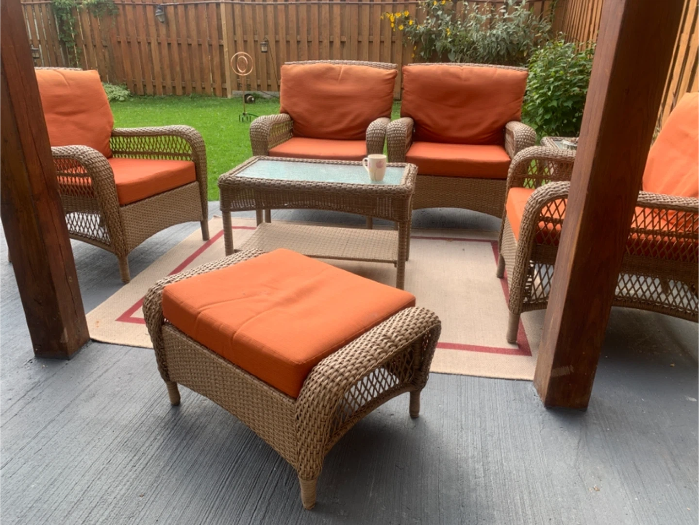 Selling a lovely patio set that includes four wicker chairs with comfy orange cushions, a matching ottoman, and a glass-topped coffee table. Perfect for enjoying those warm Canadian evenings on your deck or patio!