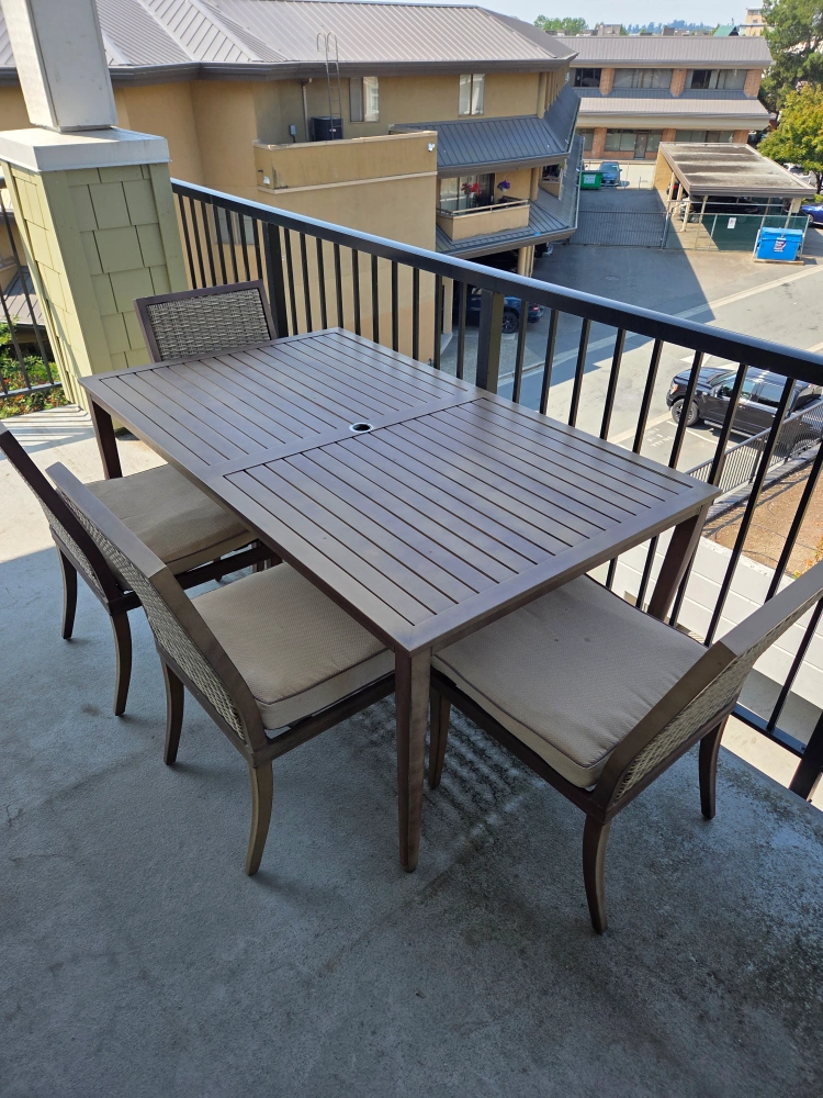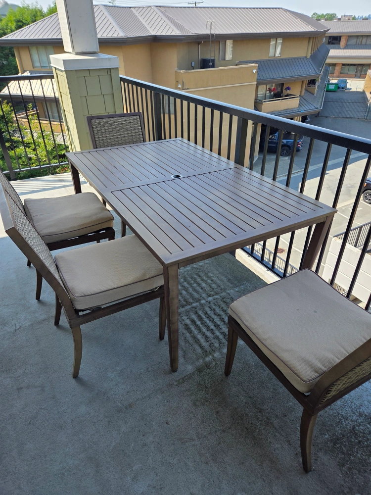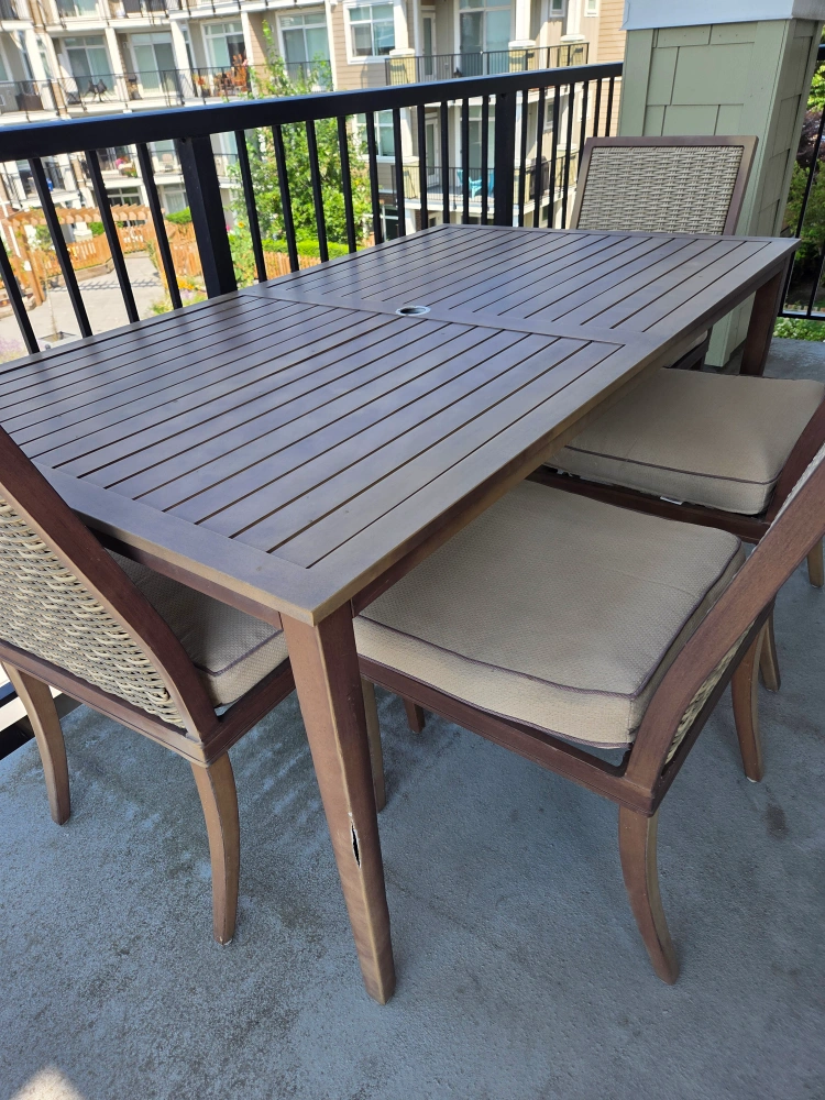 Selling a patio table and chairs set. Perfect for enjoying the outdoors on your balcony or patio. The set includes a rectangular table and four chairs with comfortable cushions. It's in good condition and ready for a new home! Patio Table 66 " Length 39.5" Width 29" Height Chairs Height 35.5" Seat Height 18.5"