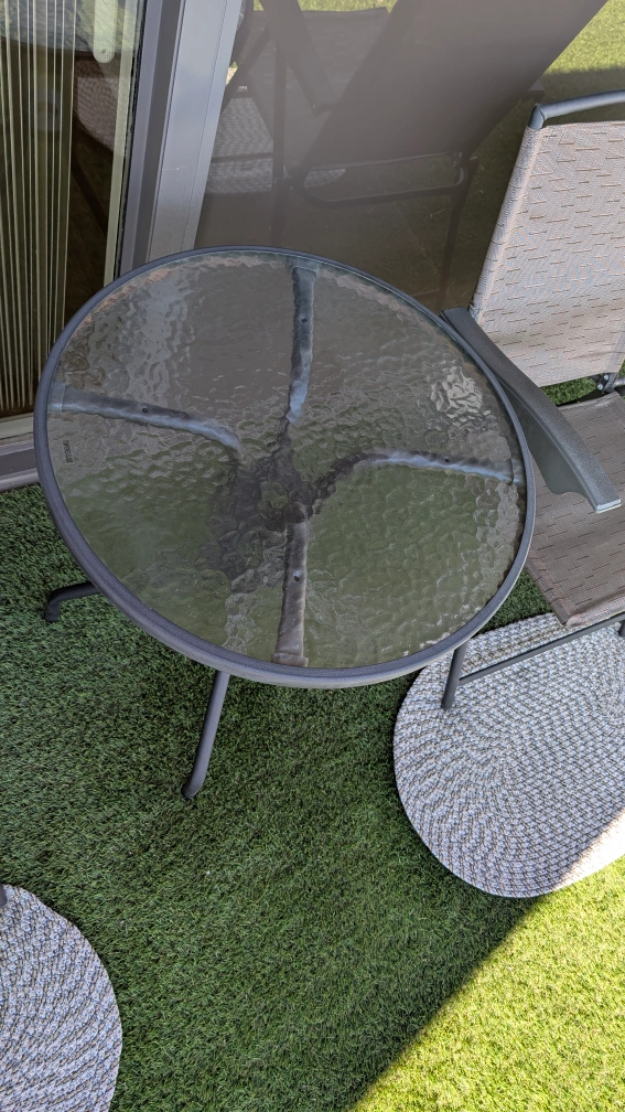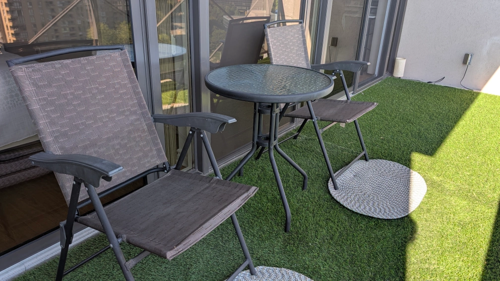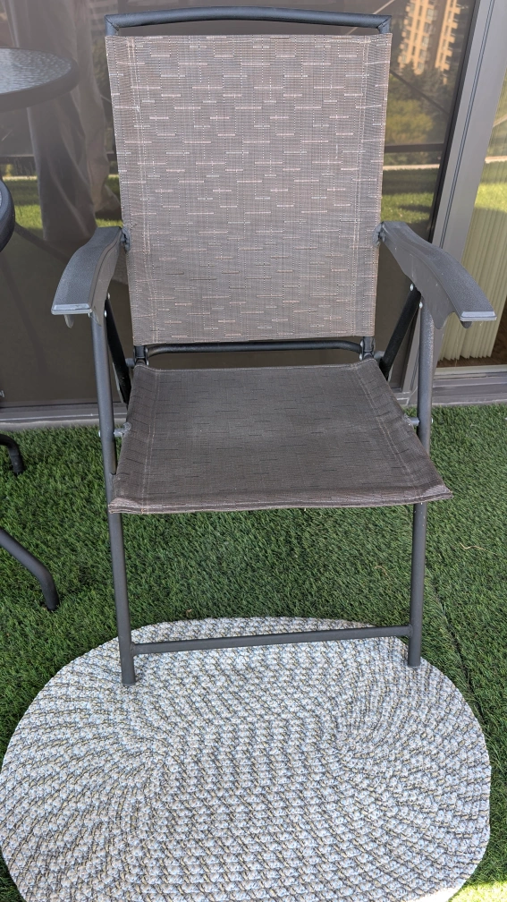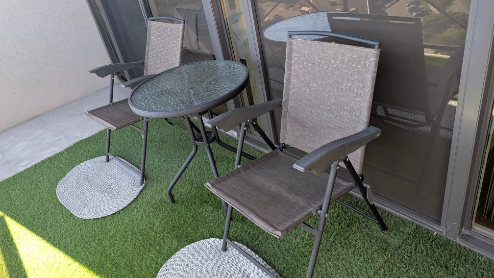 18Selling a patio table with two chairs. The set is in good condition and perfect for a small balcony or outdoor space. The table has a glass top and the chairs are foldable for easy storage. 3 Pieces Patio Bistro Set, 2 Folding Chairs with Adjustable Backrest 24" Round Table Suitable for Garden, Balcony, Patio, Deck Color: Brown Condition: Excellent Reason for sale: Move out