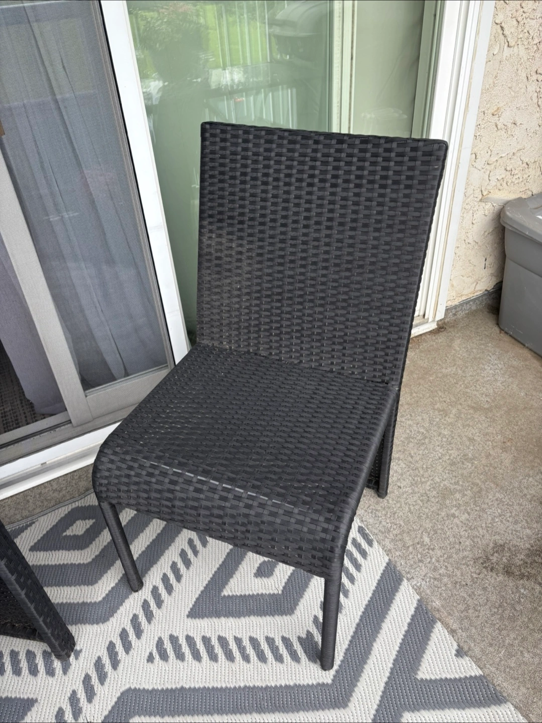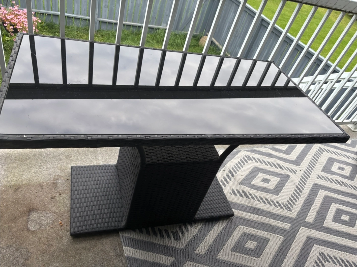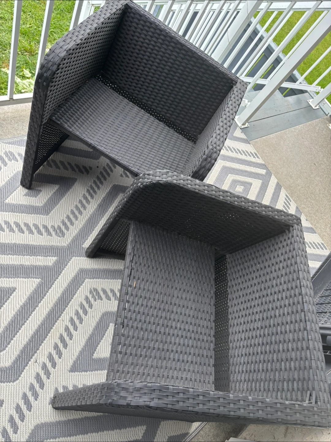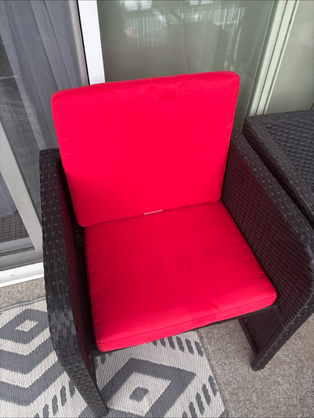 62Selling a patio table and 3 chairs set. Two chairs with arms and one without. The table has a glass top. They are a dark grey wicker style that comes with 6 red cushions. Just too big for my patio. Pick up only on the west end.