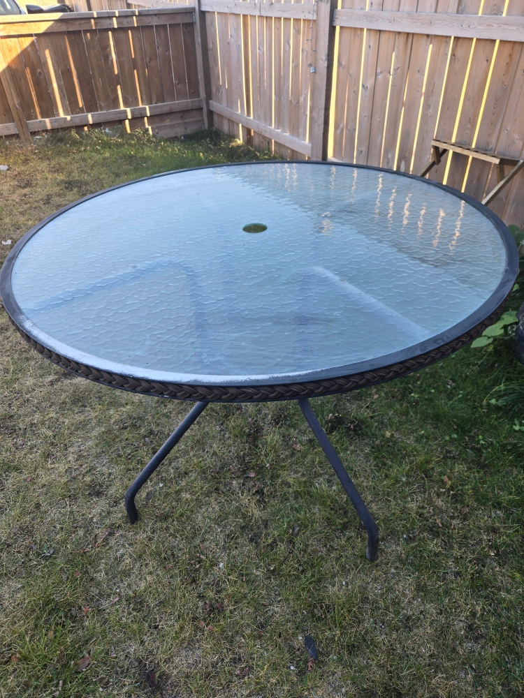 20π Outdoor Glass Patio Table β Great Condition! Perfect for your backyard, patio, or balcony! Sturdy metal frame with tempered glass top Umbrella hole in the center (umbrella not included) Seats 4 comfortably Weather-resistant and easy to clean πͺ Condition: Gently used, no cracks or major damage π Approx. size: 40β42 inches diameter π° Price: 20