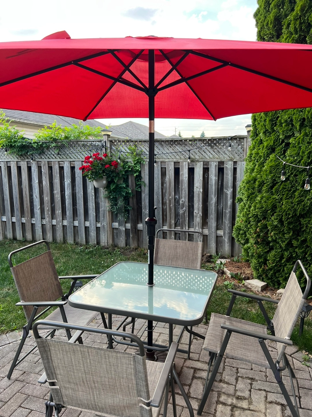 30Selling a patio table set that includes a table, four chairs, and a red umbrella. It's perfect for enjoying the outdoors! The set is in good condition and ready for a new home.