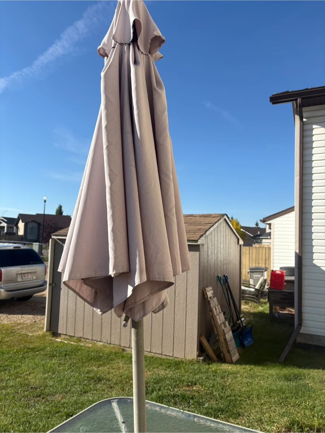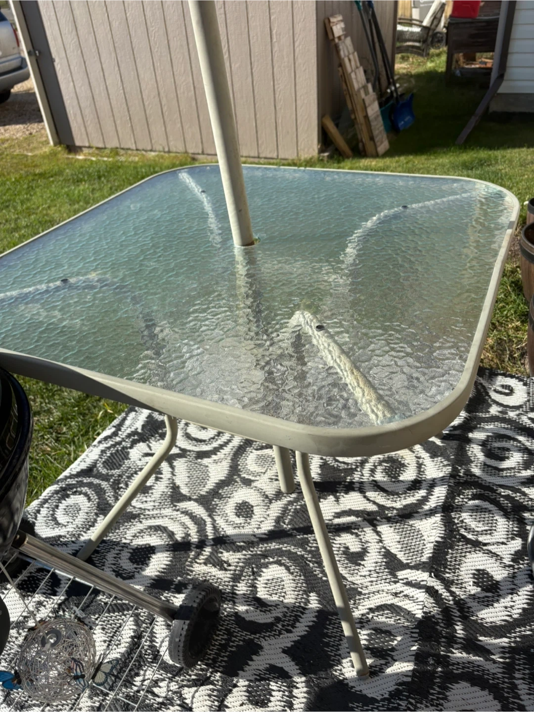 Selling a patio table with an umbrella. The table has a glass top and metal frame. Perfect for enjoying the outdoors!