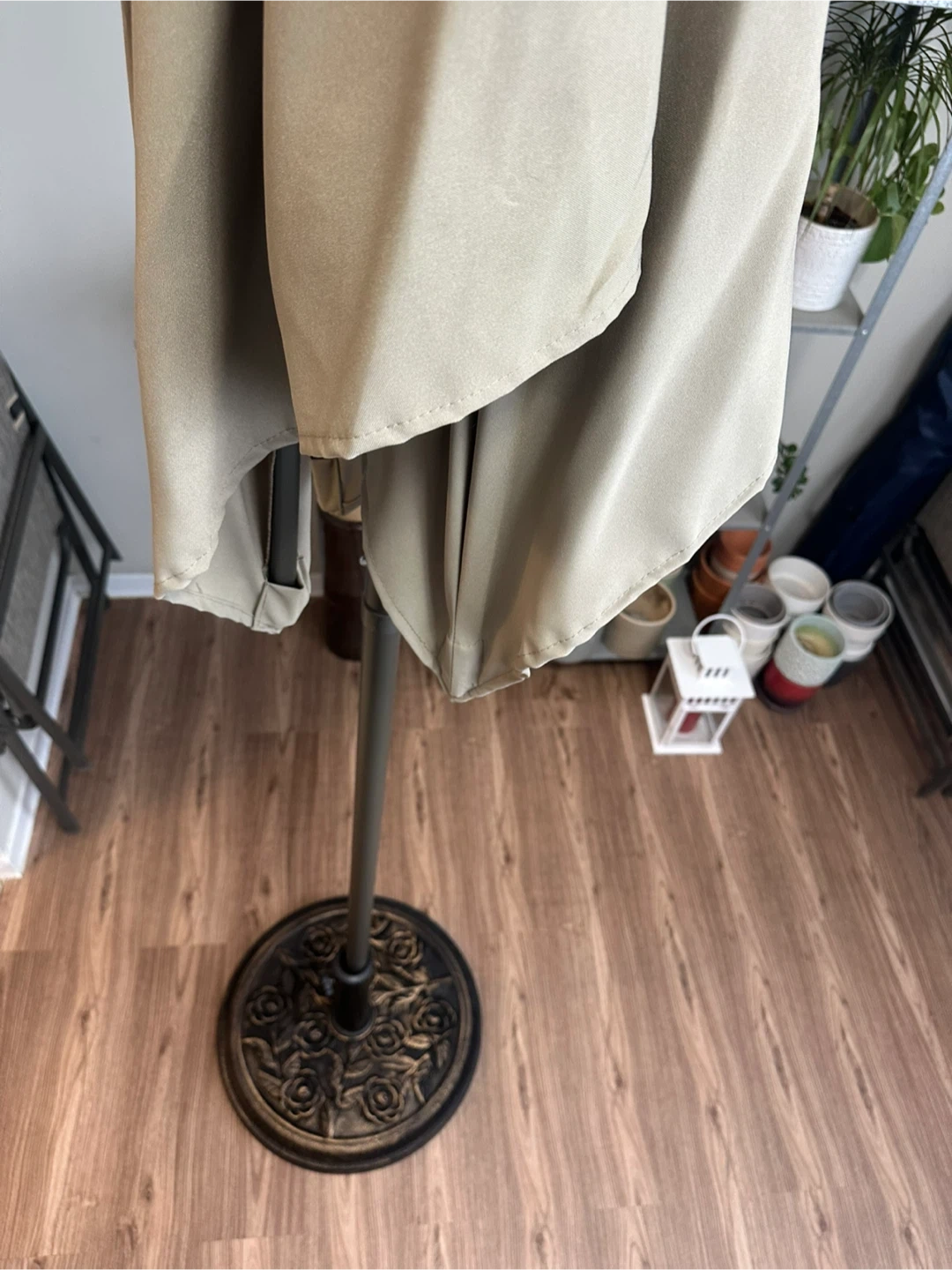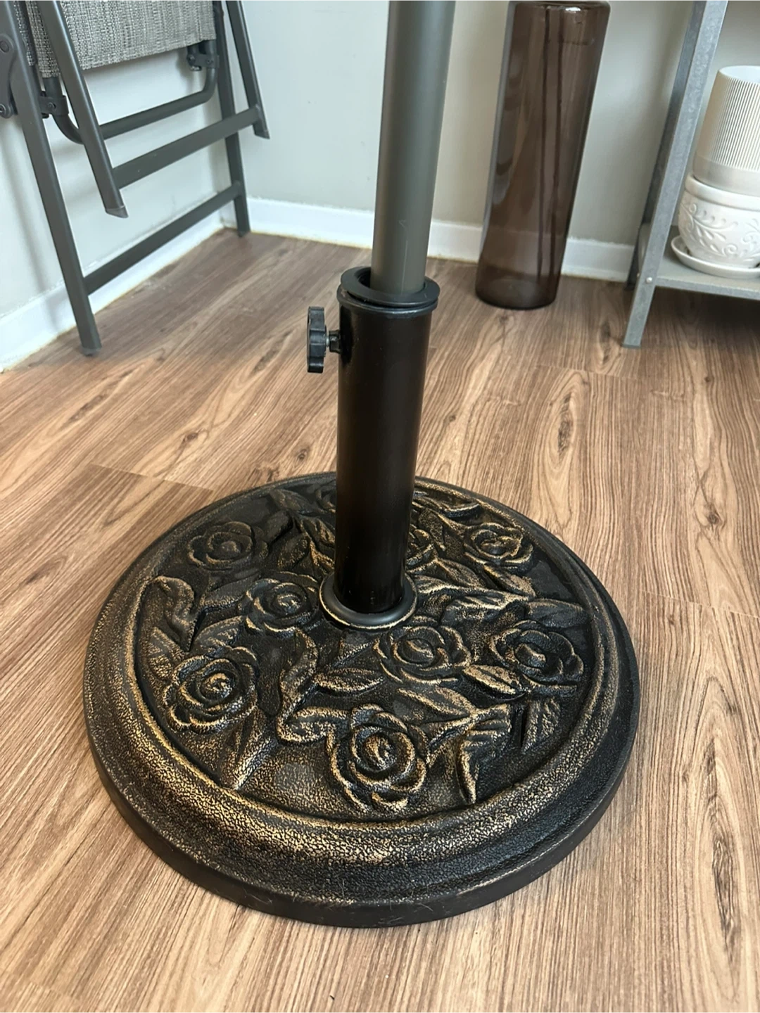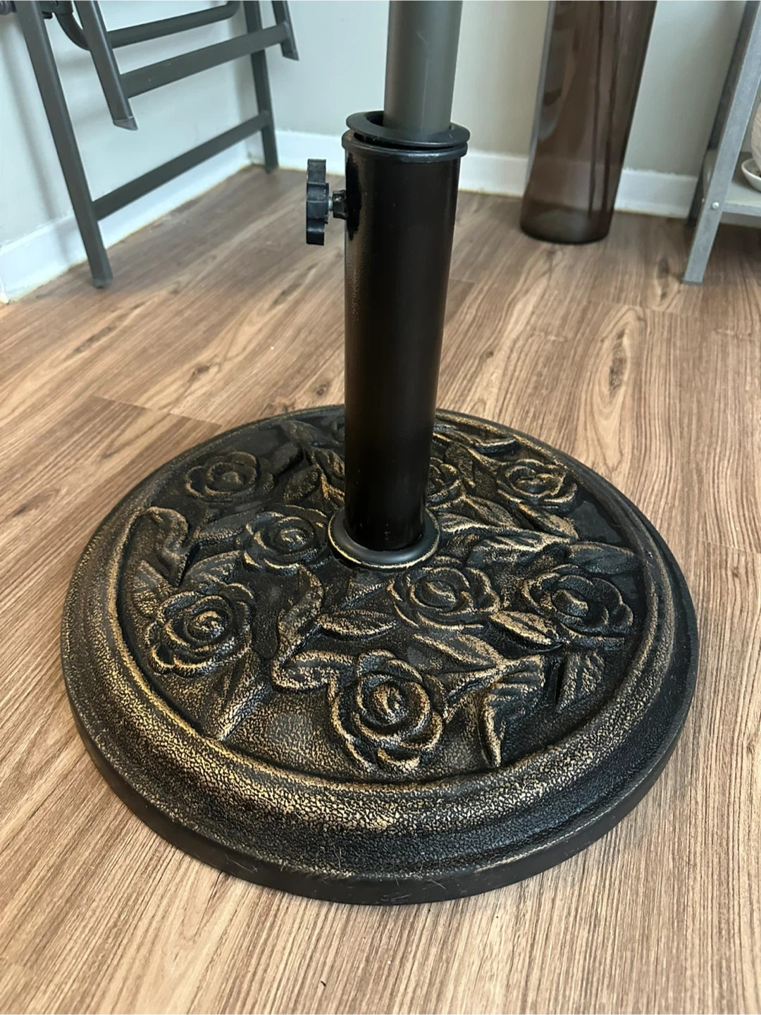 Selling a patio umbrella with a decorative rose-patterned base. Perfect for adding some shade to your outdoor space this summer! It looks brand new, since it was never used or left in the weather. ⛱️