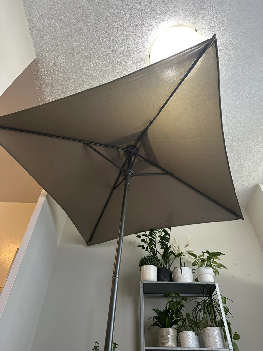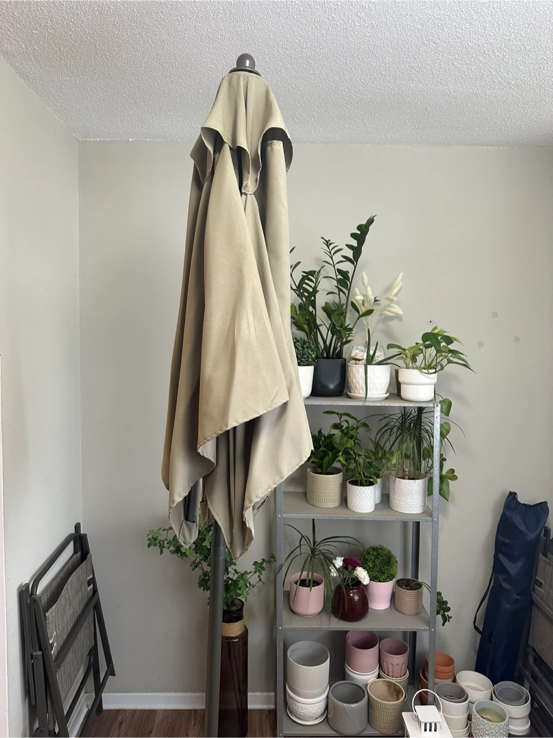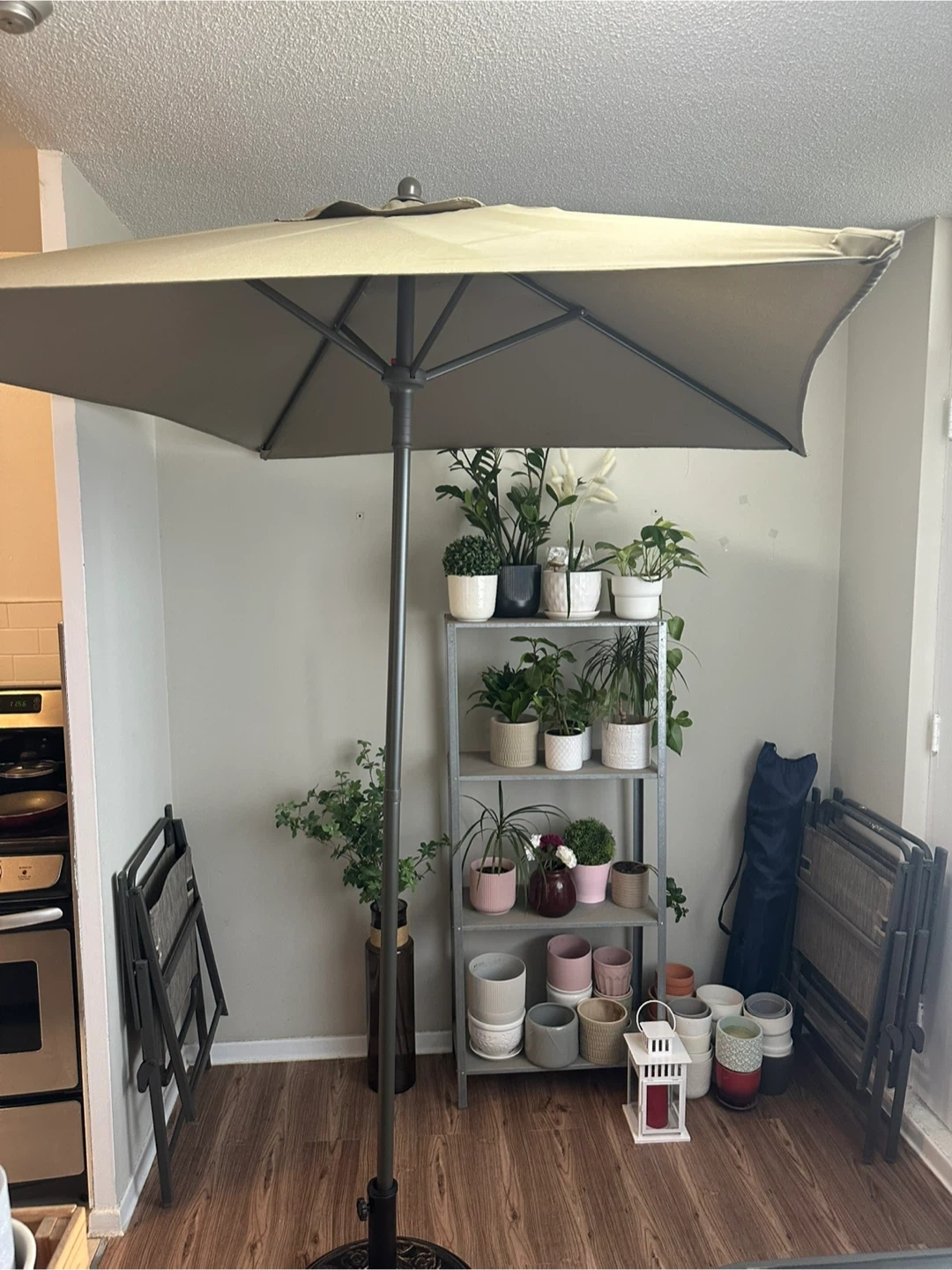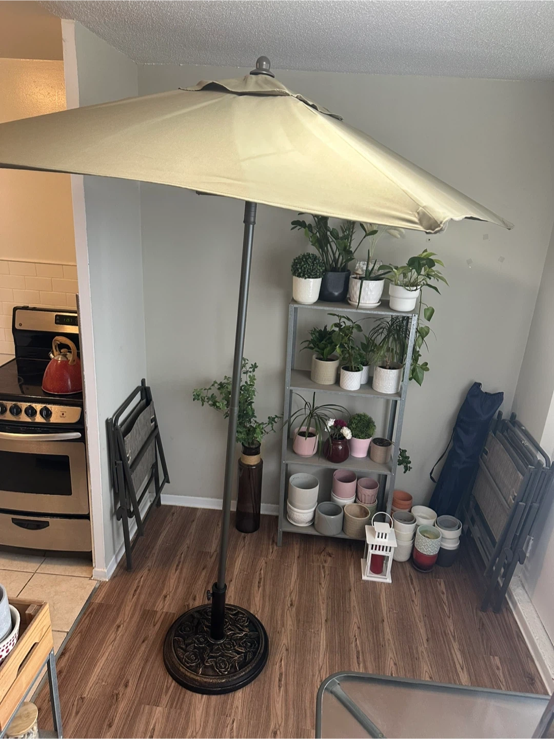 Selling a patio umbrella with a decorative rose-patterned base. Perfect for adding some shade to your outdoor space this summer! It looks brand new, since it was never used or left in the weather. ⛱️