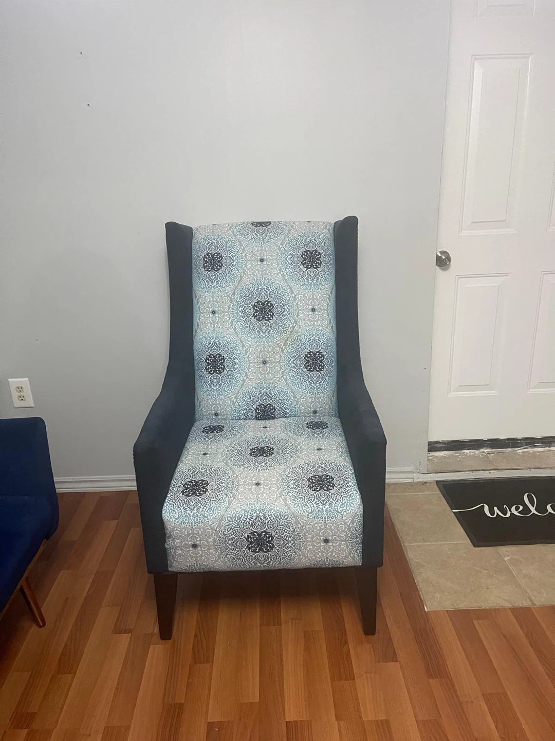 10Leon’s! Selling a stylish accent chair! It features a unique patterned design on the seat and backrest. The chair has a dark frame and legs. It's perfect for adding a touch of elegance to any room.
