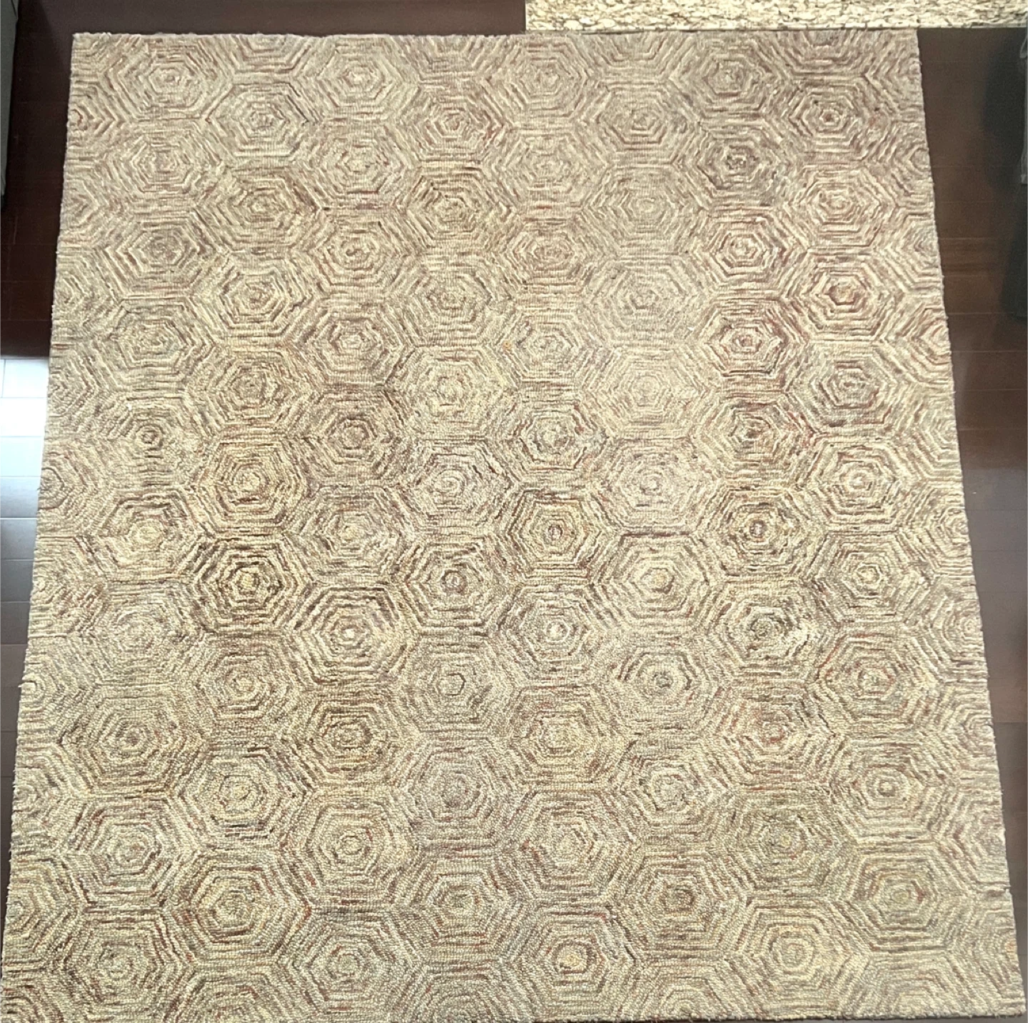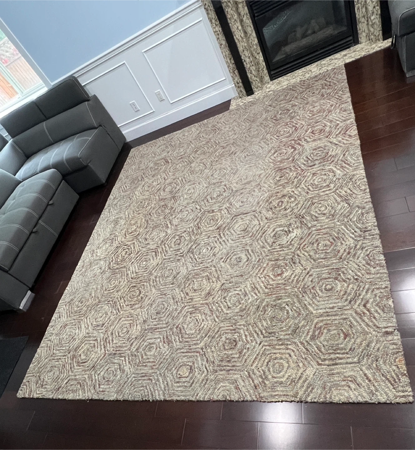 Moving sale! $50! Purchased at $350+tax Well-loved area rug with a geometric pattern. It would look great in a living room or bedroom. The rug is in good condition and has a unique design. 1 inch thickness and well-weighted for foot traffic. 8 ft x 10 ft Pick up near Metrotown.