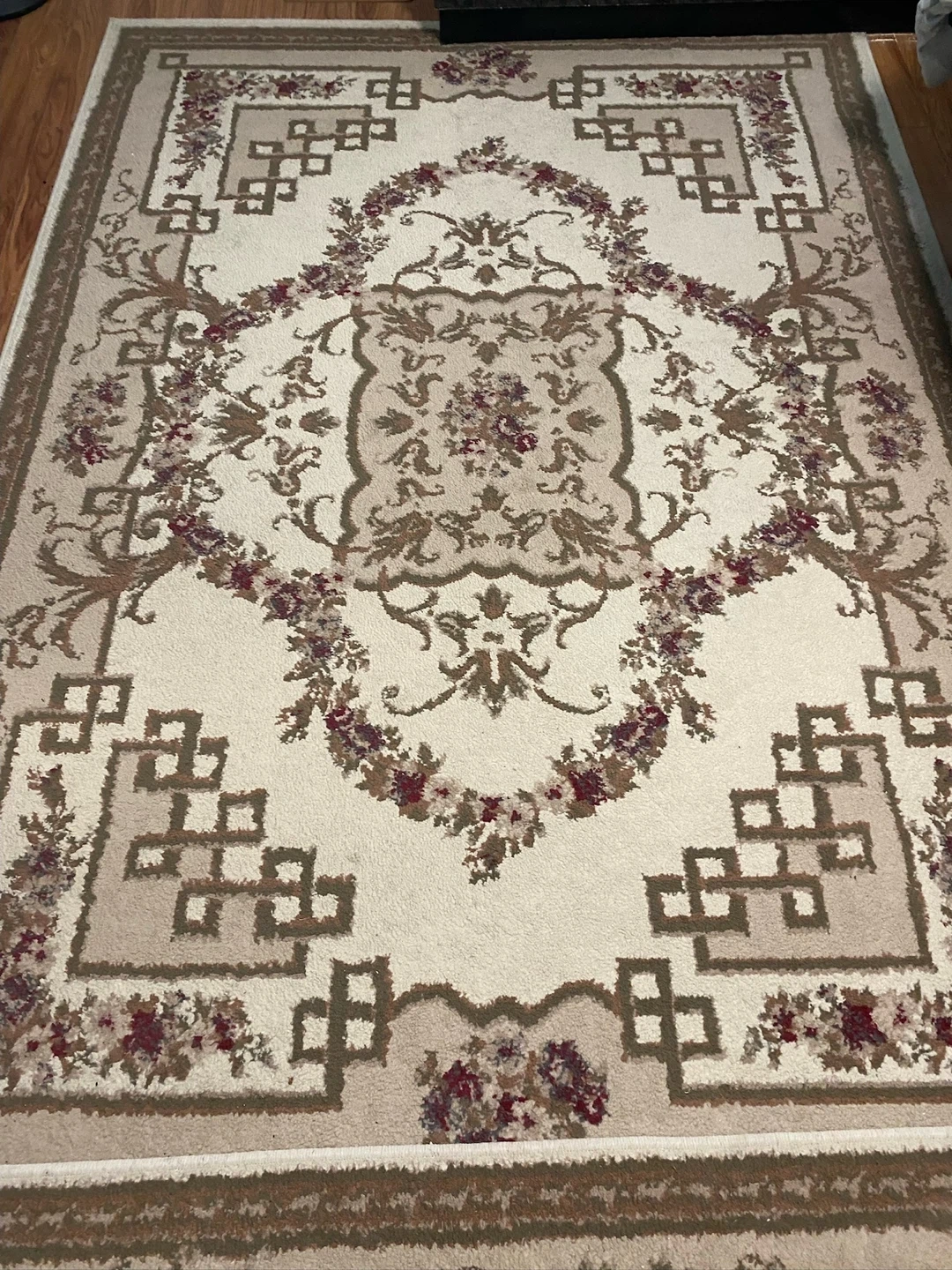 This is a patterned area rug. It features floral and geometric designs in shades of beige, brown, and burgundy. It would be a great addition to any room!