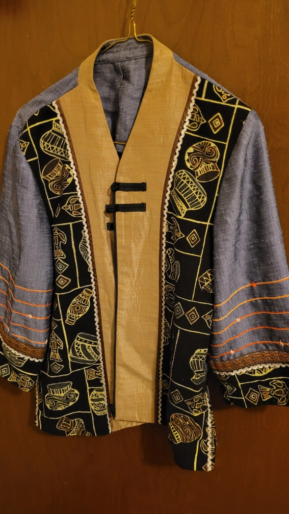 159Here's a unique jacket with an Asian-inspired design from thailand! It features a gold-toned front panel and patterned black side panels and sleeves. The jacket is in great condition and ready for a new home