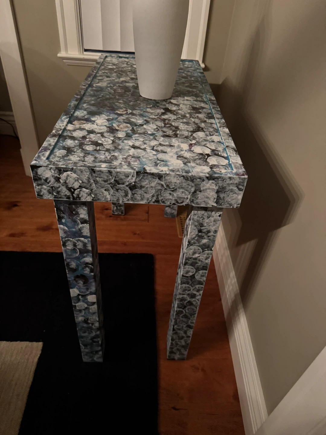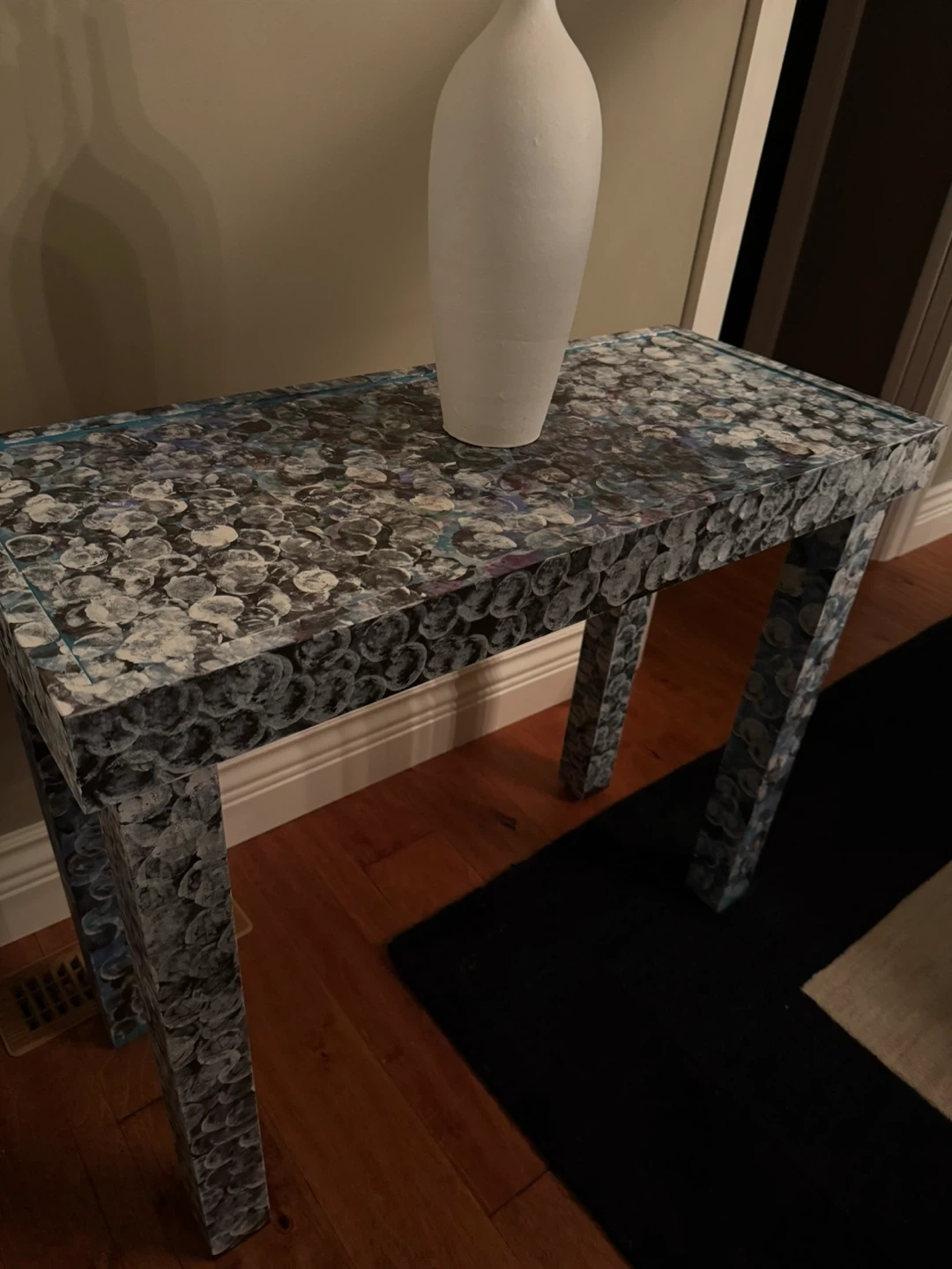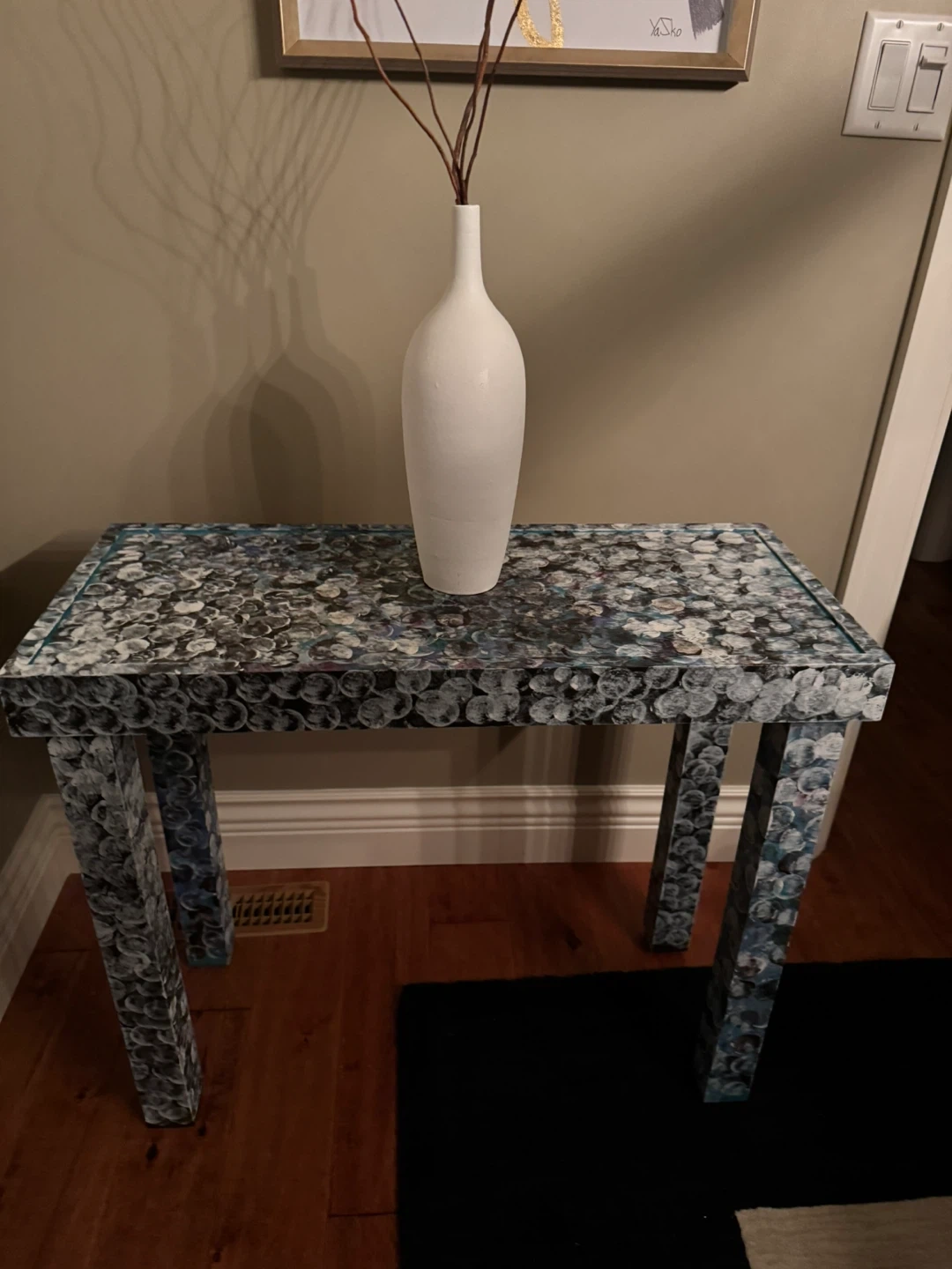 Selling a unique patterned console table. It's in great shape and would look lovely in an entryway or living room. The table features a beautiful design with a mix of blue, white, and grey colours. It's sturdy and ready for a new home!
